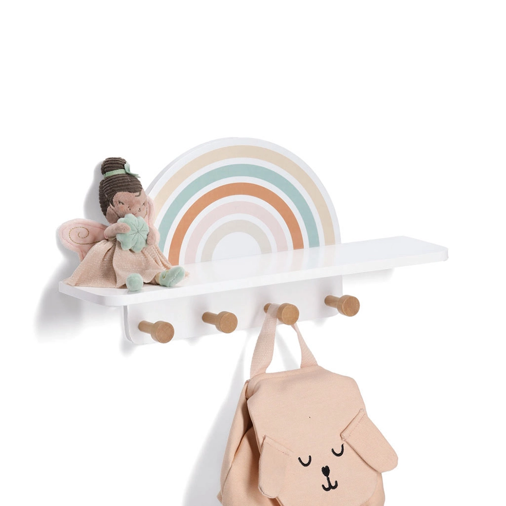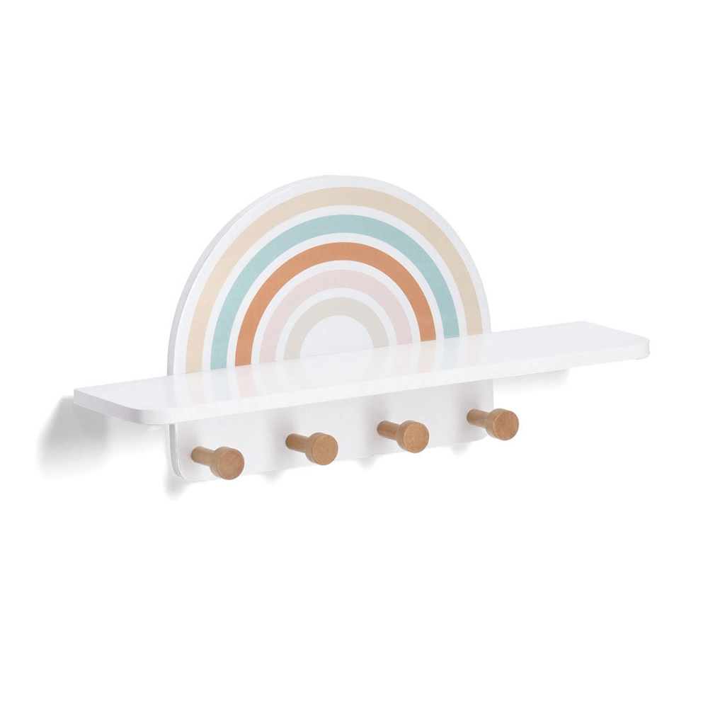 De wandkapstok regenboog van Zeller Present is ontworpen voor kinderen en combineert functionaliteit met speelse charme. Of je nu jassen, rugzakken of mutsen wilt ophangen, deze kapstok biedt voldoende ruimte en zorgt voor een nette en georganiseerde kinderkamer. Het stevige ontwerp zorgt voor jarenlang gebruiksplezier, terwijl het regenboogthema voor een glimlach op het gezicht van je kind zorgt.