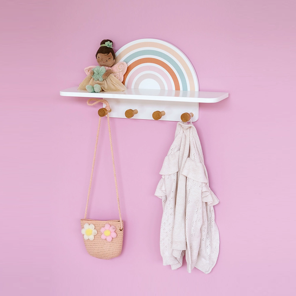 De kapstok is gemaakt van hoogwaardig MDF en grenenhout, wat zorgt voor een stevige en duurzame constructie, ideaal voor dagelijks gebruik door kinderen. Deze wandkapstok is 48 cm breed, 13 cm diep en 24 cm hoog, en biedt voldoende ophangruimte voor kleine kledingstukken. Daarnaast is er een handige plank bovenop, perfect voor het neerzetten van kleine spulletjes zoals Tonie-figuren, speelgoed of accessoires. De kapstok kan eenvoudig aan de muur worden gemonteerd en is perfect te combineren met andere items uit de "Rainbow" serie, voor een complete kinderkamerinrichting. Deze kapstok kinderen is niet alleen praktisch, maar ook een leuke decoratieve toevoeging aan elke kamer. Bekijk ook deze bijpassende opbergkist in regenboogvorm.