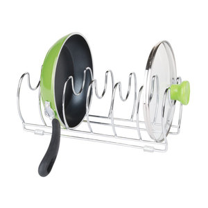 Dit koekenpannenrek heeft 6 compartimenten voor het opbergen van bijvoorbeeld drie koekenpannen en bijbehorende deksels. De anti-slip voetjes voorkomen krassen en zorgt dat het stevig staat. Je kunt het in de keukenkast plaatsen, maar uiteraard ook op het keukenblad zelf.