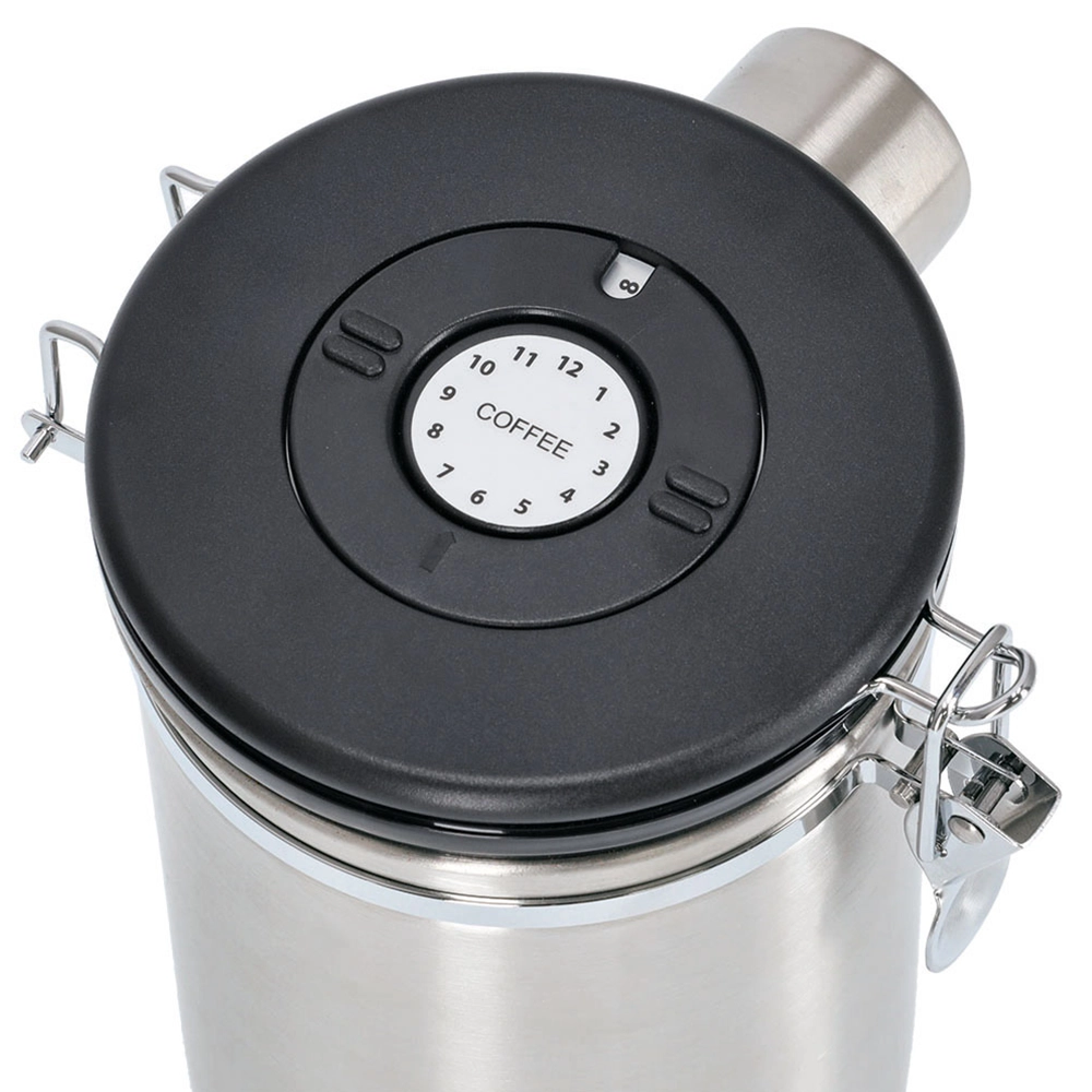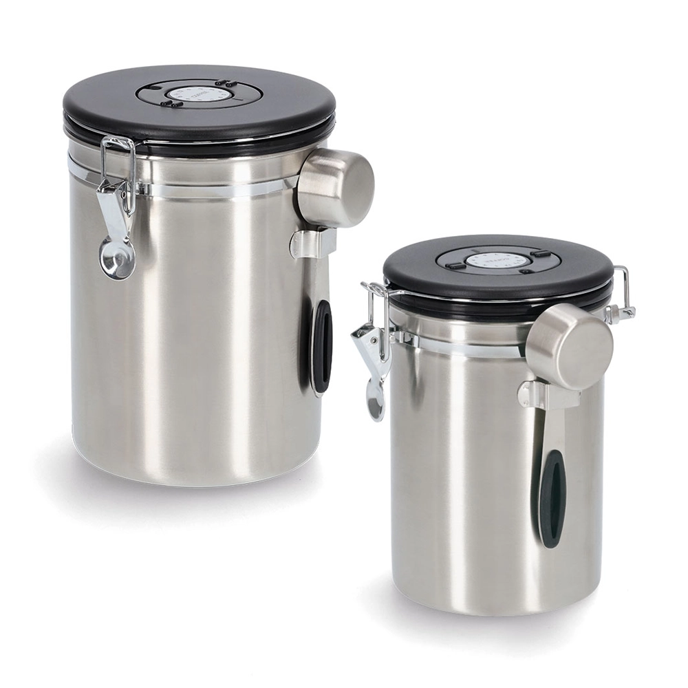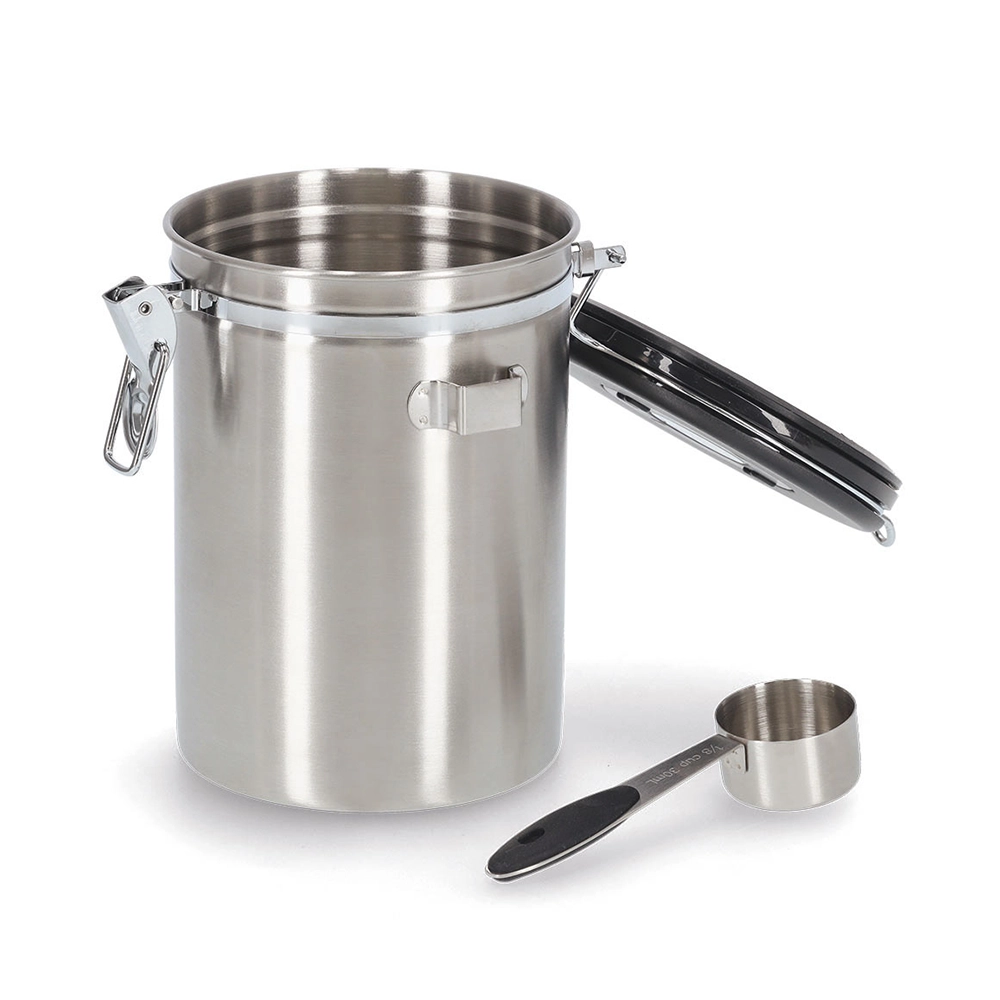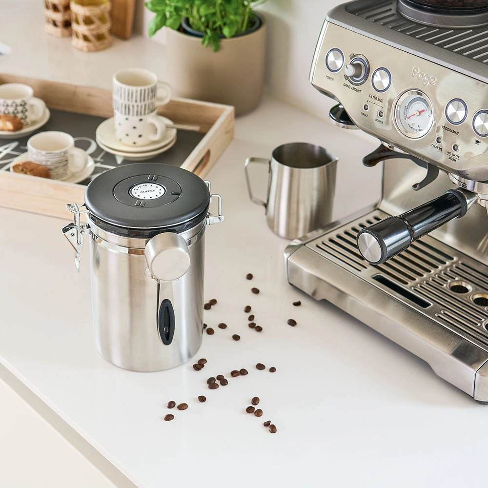 Dit tijdloze koffieblik is gemaakt van duurzaam roestvrij staal en hoogwaardig kunststof. Het luchtdichte kunststof deksel sluit perfect af met behulp van clipsluitingen, waardoor er geen lucht of vocht bij jouw kostbare koffie kan komen. Zo blijft de smaak en aroma behouden, zelfs na langere tijd. Of je nu een fervent koffieliefhebber bent of gewoon wilt genieten van een heerlijk kopje koffie, dit koffieblik met datum is een absolute must-have. En als je behoefte hebt aan nog meer opslagruimte, is dit koffieblik ook verkrijgbaar in een groter formaat.