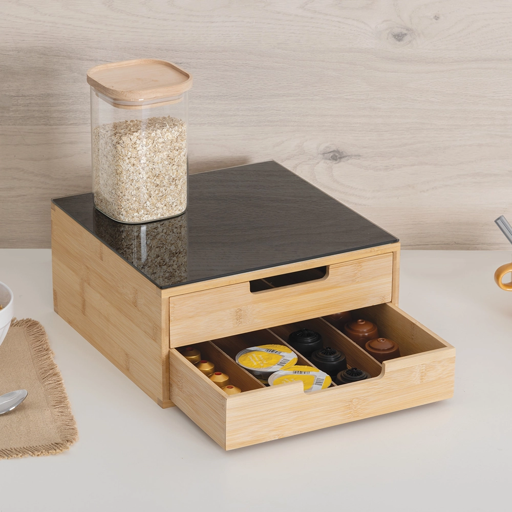 Bamboe is een populair materiaal voor keukenartikelen. Het is namelijk duurzaam, stevig en heeft daarnaast ook nog eens een luxe uitstraling. Het strakke design van de koffiecapsulehouder in combinatie met de warme kleur van het materiaal, is de capsulehouder een stijlvol item in je keuken. Daarnaast is bamboe ook een duurzamer alternatief dan andere materialen, omdat bamboe zeer snel groeit op een relatief klein stuk grond. Daarnaast heeft bamboe een lange levensduur, en ben je ervan verzekerd dat deze koffiecup houder lang mee gaat. Als je op zoek bent naar nog meer bamboe organizers, kijk dan eens bij de Bamboo Kitchen collectie van Five®.