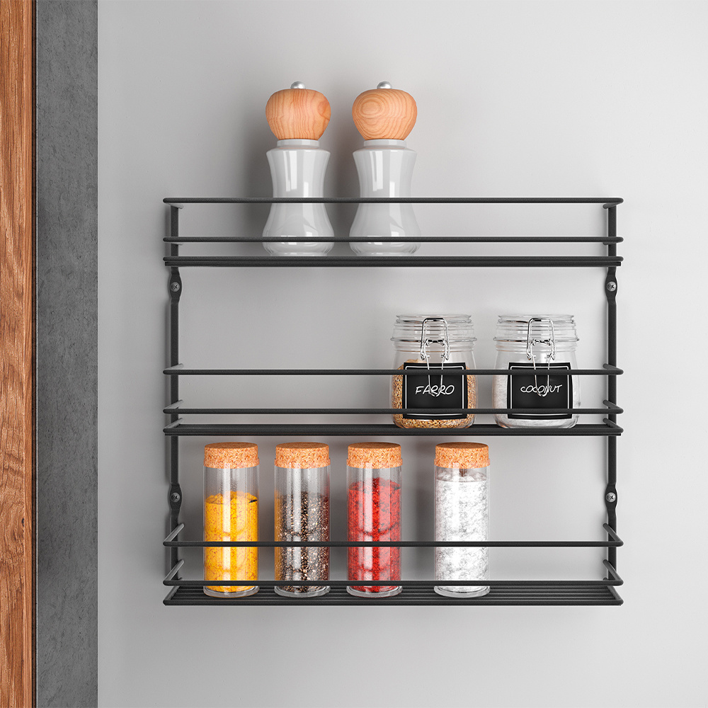 Het wandrek heeft een matzwarte kleur en een luxe TouchTherm-coating die antistatisch, roest- en krasbestendig is en tevens eenvoudig schoon te houden is. Het kruidenrek voor aan de muur is er in 3 varianten, variërend met 2, 3 of 4 etages in de volgende afmetingen: