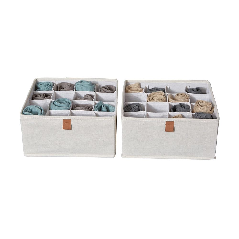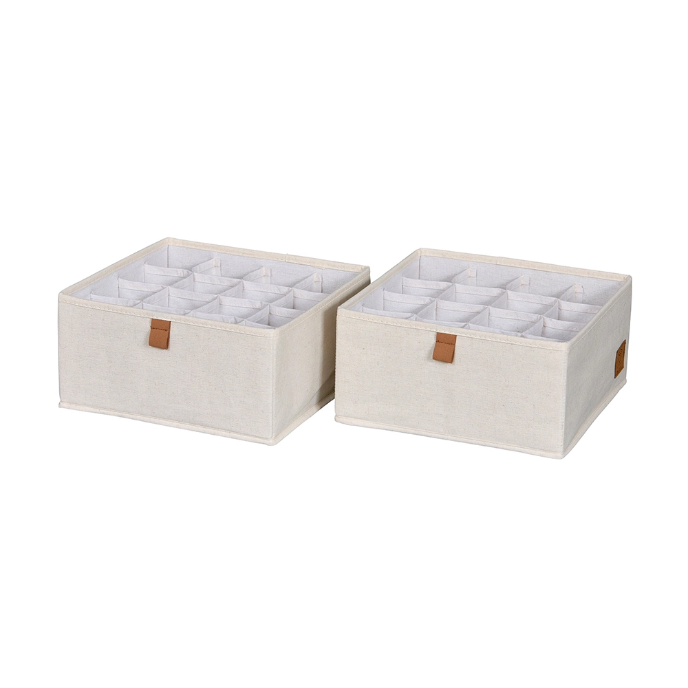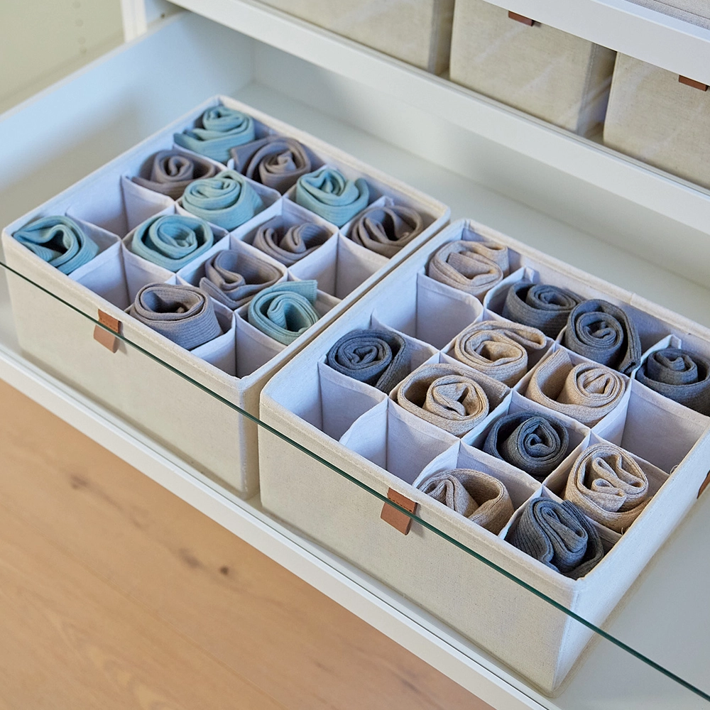 Onze lade mandjes zijn ontworpen met oog voor detail en veelzijdigheid. Bekleed met luxe linnen stof en een onderhoudsvriendelijke polyester binnenkant, combineren deze mandjes duurzaamheid met een elegante uitstraling. De lusjes en het logo zijn vervaardigd uit textielleder, terwijl de verstevigde MDF-wanden en bodem extra stevigheid bieden. Deze mandjes zijn ideaal voor het opbergen van kleding, ondergoed, bh's, sokken en andere accessoires in de kledingkast, evenals voor kleine spullen in de badkamer, kinderkamer of luiertafel. Met ons lade-indelingssysteem houd je alles netjes en overzichtelijk. Verkrijgbaar in een medium formaat van 15 cm breed, 30 cm diep en 15 cm hoog, of een large formaat van 30 cm breed, zijn deze lade mandjes perfect voor elke lade indeling in de kledingkast.