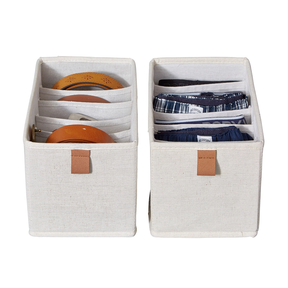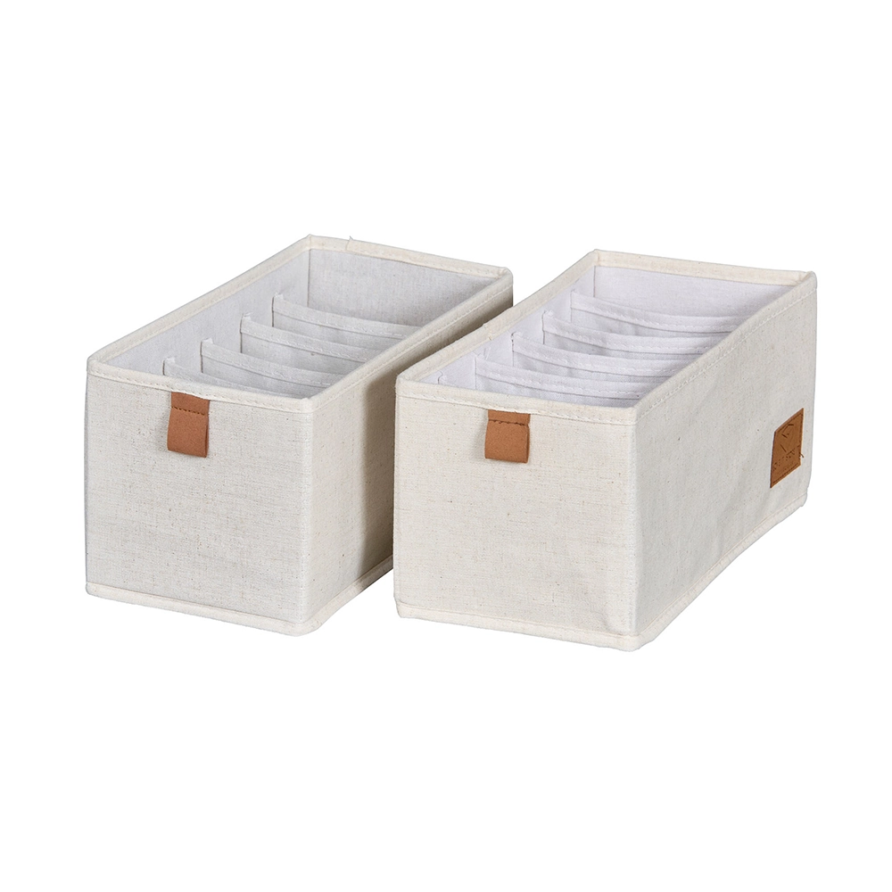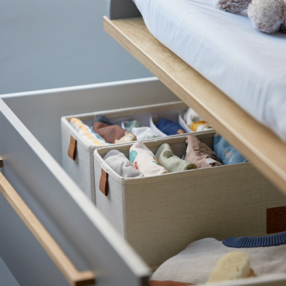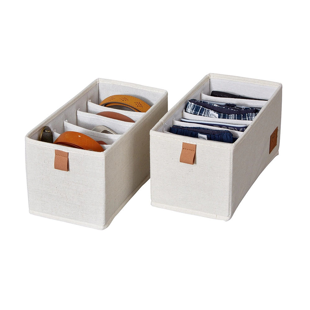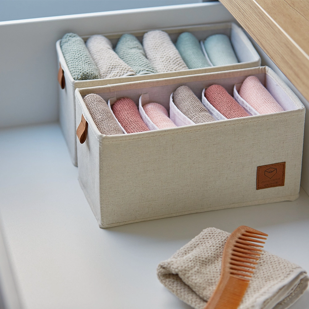 Onze lade mandjes zijn ontworpen met oog voor detail en veelzijdigheid. Bekleed met luxe linnen stof en een onderhoudsvriendelijke polyester binnenkant, combineren deze mandjes duurzaamheid met een elegante uitstraling. De lusjes en het logo zijn vervaardigd uit textielleder, terwijl de verstevigde MDF-wanden en bodem extra stevigheid bieden. Deze mandjes zijn ideaal voor het opbergen van kleding, ondergoed, bh's, sokken en andere accessoires in de kledingkast, evenals voor kleine spullen in de badkamer, kinderkamer of luiertafel. Met ons lade-indelingssysteem houd je alles netjes en overzichtelijk. Verkrijgbaar in een medium formaat van 15 cm breed, 30 cm diep en 15 cm hoog, of een large formaat van 30 cm breed, zijn deze lade mandjes perfect voor elke lade indeling in de kledingkast.