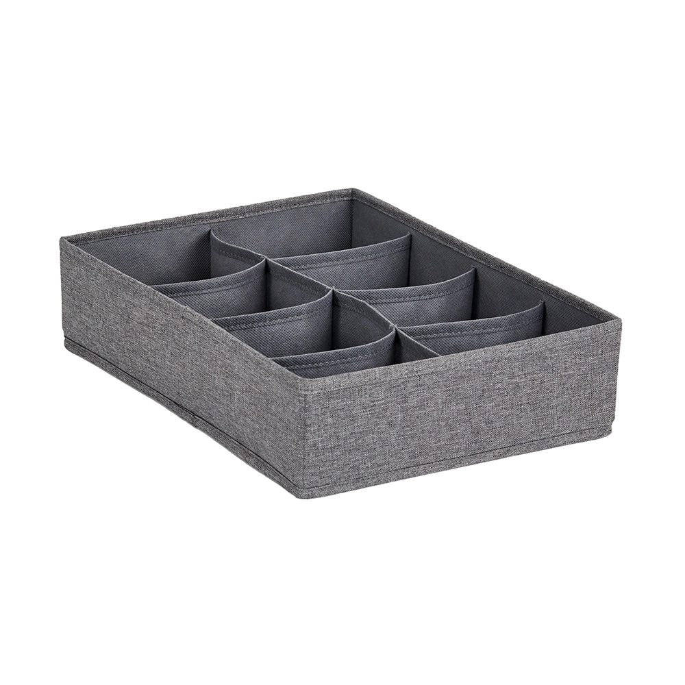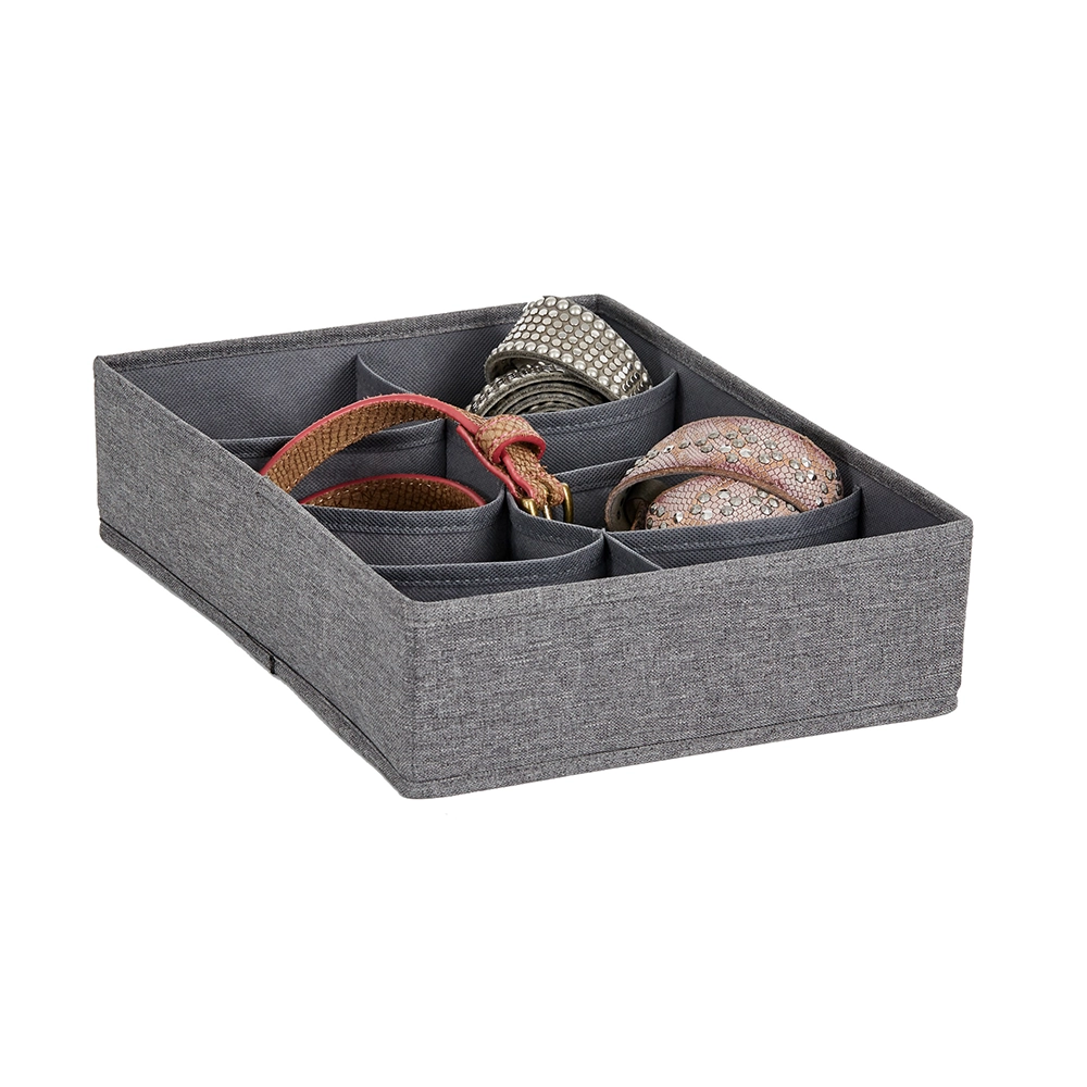 Deze lade mandjes zijn uitgerust met 8 of 24 handig ingedeelde vakken, perfect voor het systematisch opbergen van ondergoed, sokken, riemen en accessoires. De elegante buitenzijde van linnen en de onderhoudsvriendelijke binnenkant van polyester waarborgen de duurzaamheid en beschermen je kostbaarheden. De toevoeging van stijlvolle handgrepen van textielleder verhoogt niet alleen de bruikbaarheid maar ook de visuele aantrekkingskracht.