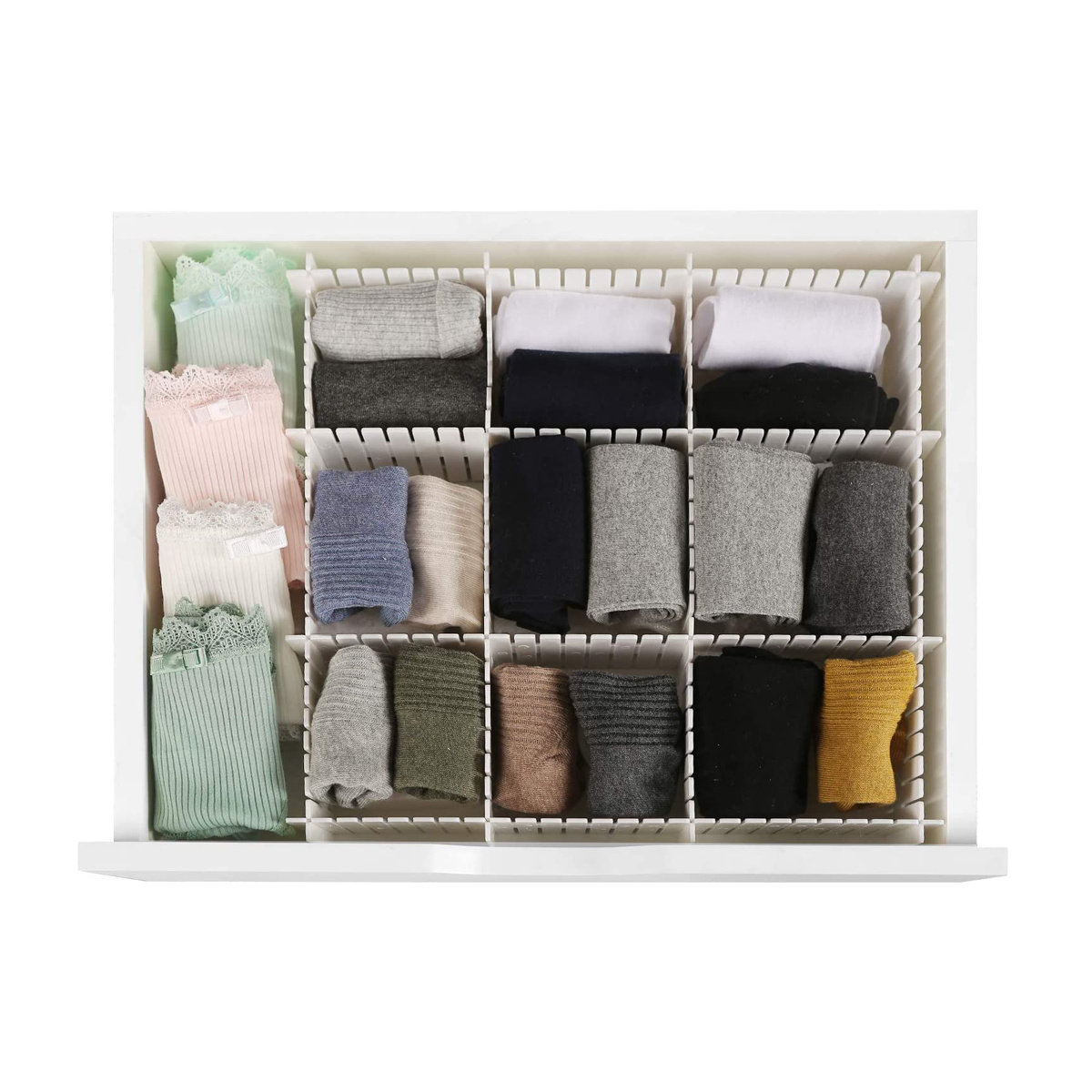 Met deze verstelbare ladeverdeler creëer je precies de vakken die jij nodig hebt voor het opbergen van onder andere je sokken, ondergoed, riemen of stropdassen. Maak vierkante of rechthoekige vakken.