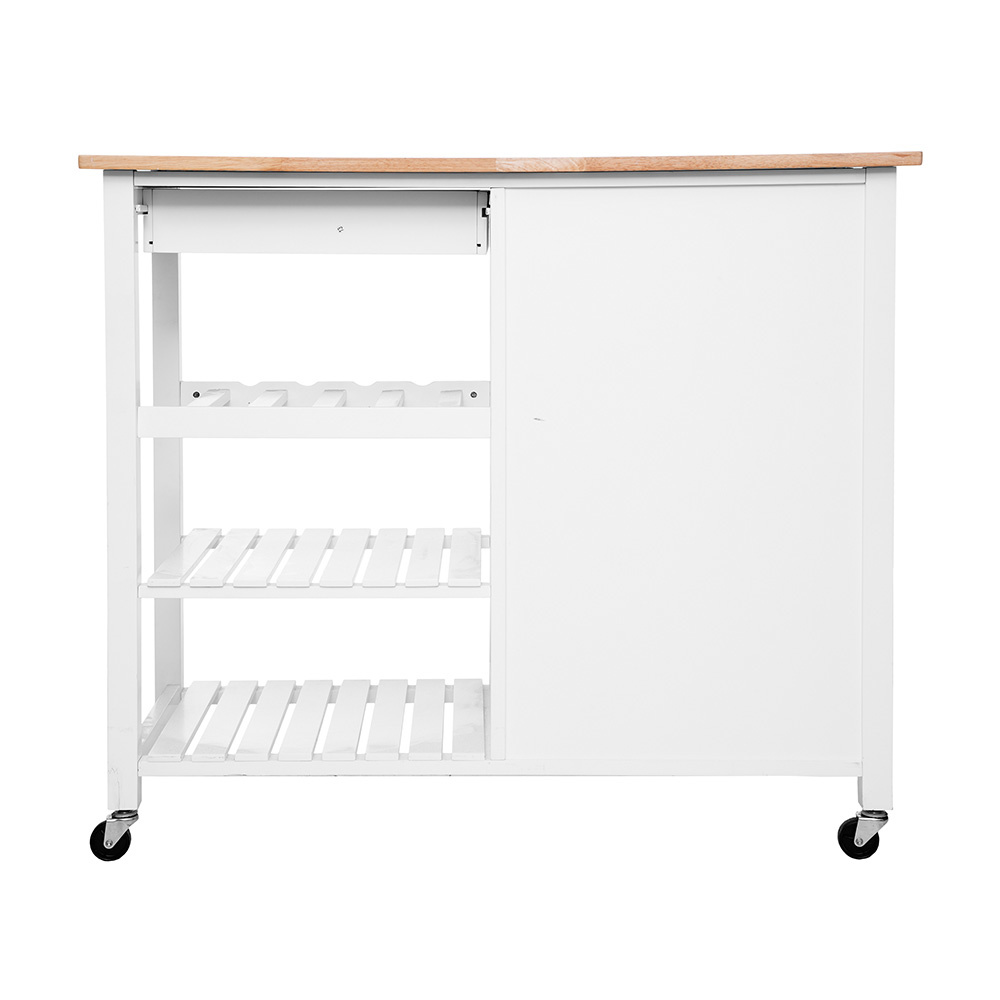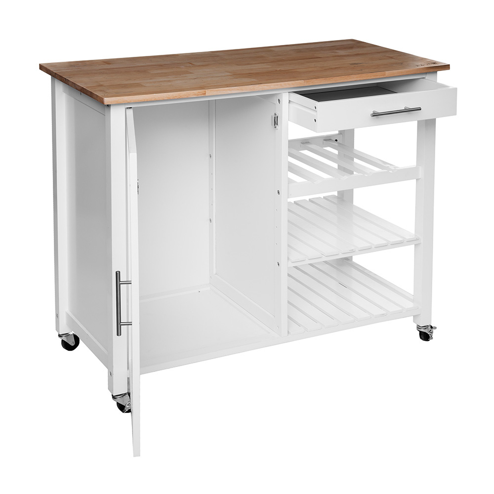 Deze houten trolley is gemakkelijk te gebruiken in elke keuken. De opberger heeft een luxe uitstraling en is voorzien een houtkleurig werkblad en een wit, houten frame. Aan de linkerkant van deze witte keukentrolley zit een kastje waar je gemakkelijk servies of glazen kan opbergen zonder dat ze direct zichtbaar zijn. Aan de rechterkant zit een opberglade met daaronder een wijnfleshouder met plek voor 4 flessen. Onder de wijnfleshouder heb je nog twee planken waar je gemakkelijk keukengerei of andere spullen op kan zetten. Deze luxe trolley van Five® is voorzien van zwenkwieltjes die ervoor zorgen dat je de trolley gemakkelijk kan verrijden.