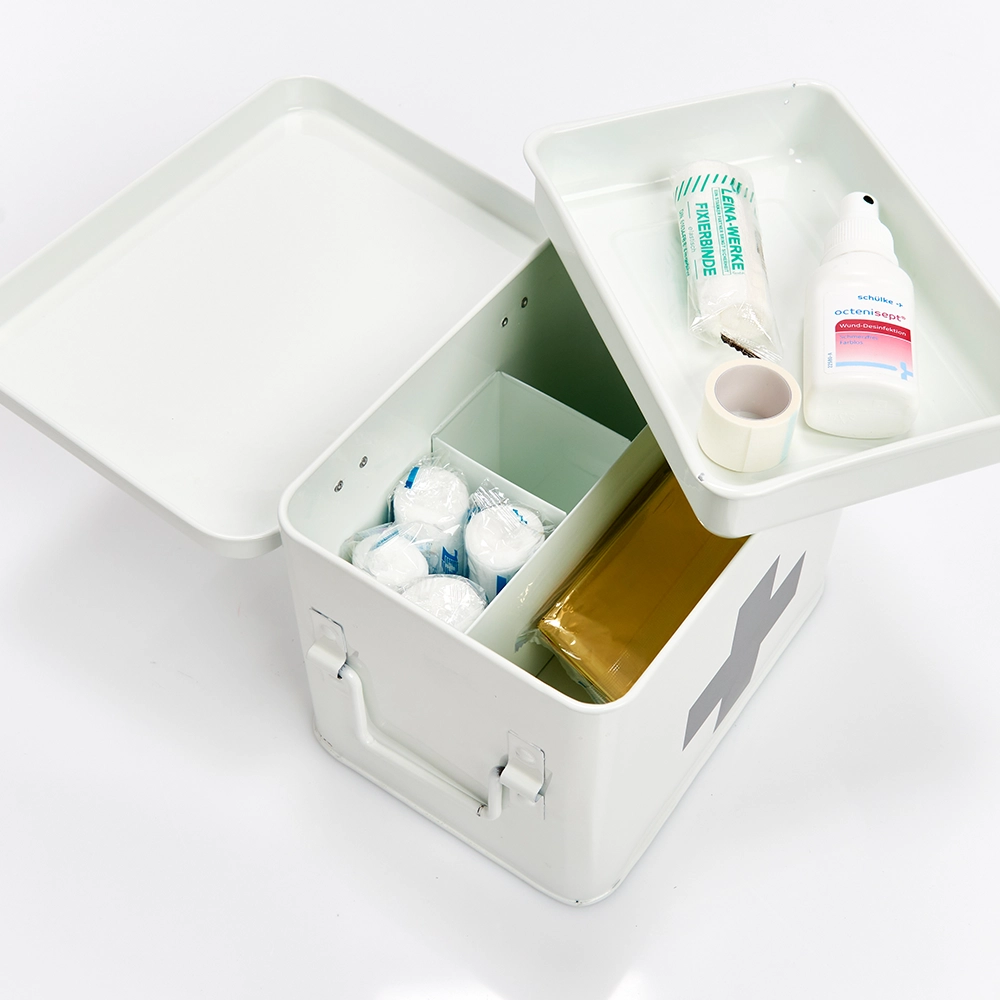 Vier of vijf handige compartimenten, gescheiden door een uitneembaar metalen inzetstuk en daar bovenop een uitneembaar bakje, zorgen ervoor dat je medicijnen, pleisters en andere eerstehulpartikelen geordend blijven in deze EHBO box. Elk vak is ruim genoeg om verschillende items overzichtelijk op te bergen, terwijl het geheel compact genoeg blijft om gemakkelijk mee te nemen dankzij de twee draaggrepen.