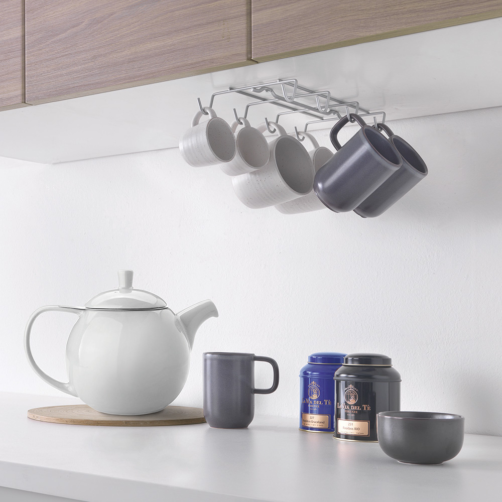 Dit kopjesrek wordt eenvoudig onder aan een keukenkastje of plank worden gemonteerd en biedt plaats voor maximaal kopjes, mokken of keukengerei.