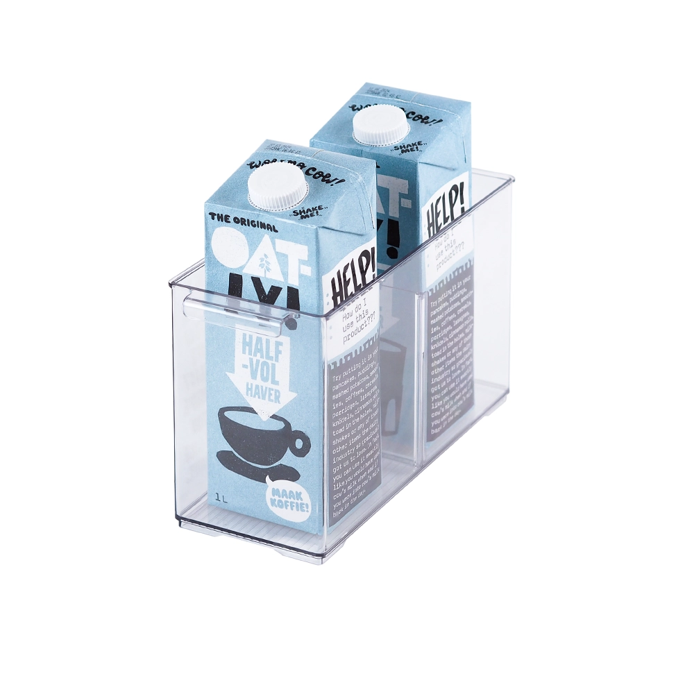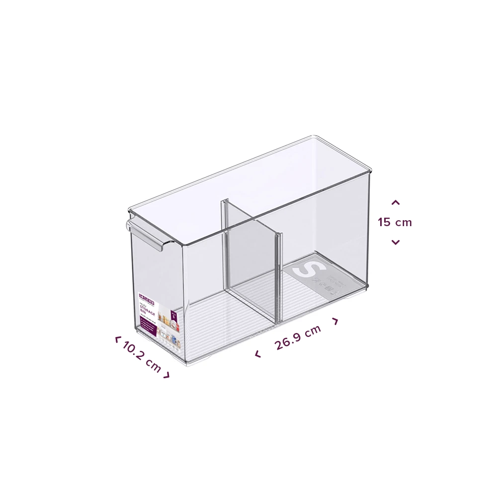 Het transparante opbergbakje is gemaakt van kunststof en is BPA-vrij. Dit maakt het voedselveilig voor het bewaren van onverpakte etenswaren. Het bakje kenmerkt zich door de uitneembare verdelers waarmee je vakken creëert of juist verwijderd. Deze veelzijdige organizer is echter niet beperkt tot enkel de keuken. Ook andere items zoals make-up of kantoorbenodigdheden kan je er in kwijt. De handvaten maken het makkelijk verplaatsbaar. Ook geldt er een garantie van maarliefst 12 maanden op deze bakjes. Je hebt de keuze uit 4 formaten met allemaal dezelfde hoogte en dieptemaat maar welke wel verschillen in breedte: Small, Medium, Large en Extra Large. De kleinste formaten hebben 1 uitneembare verdeler terwijl de grootste variant plek biedt voor 2 uitneembare verdelers. Alle opbergbakjes zijn stapelbaar en te combineren met elkaar. Er is ook een diepere variant beschikbaar met een dieptemaat van 37.1 cm. De afmetingen van deze varianten zijn als volgt: