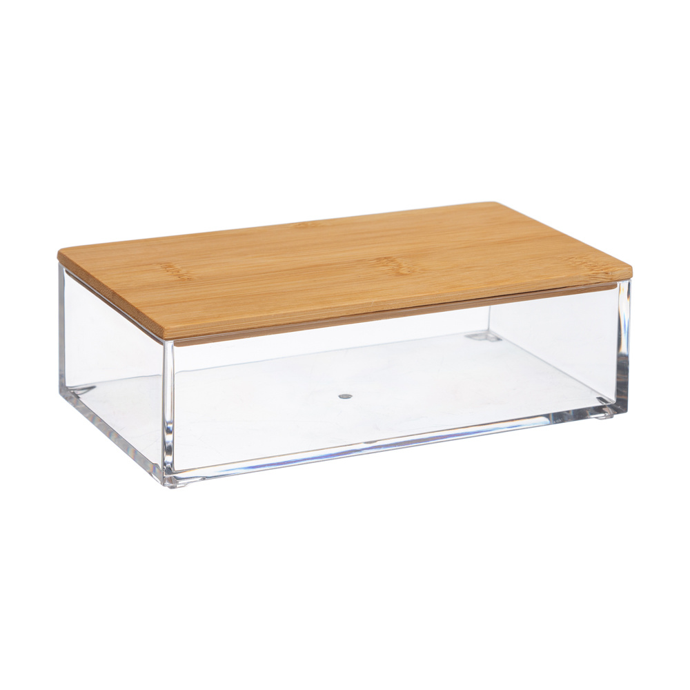 Handige opbergbakjes met bamboe dekseltje, beschikbaar in verschillende uitvoeringen. Door het acryl bakje kan je goed zien wat er in het doosje zit.