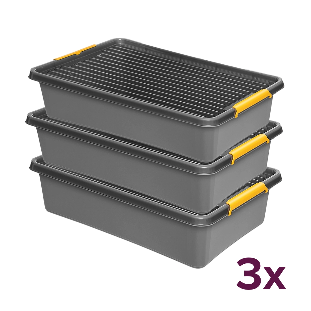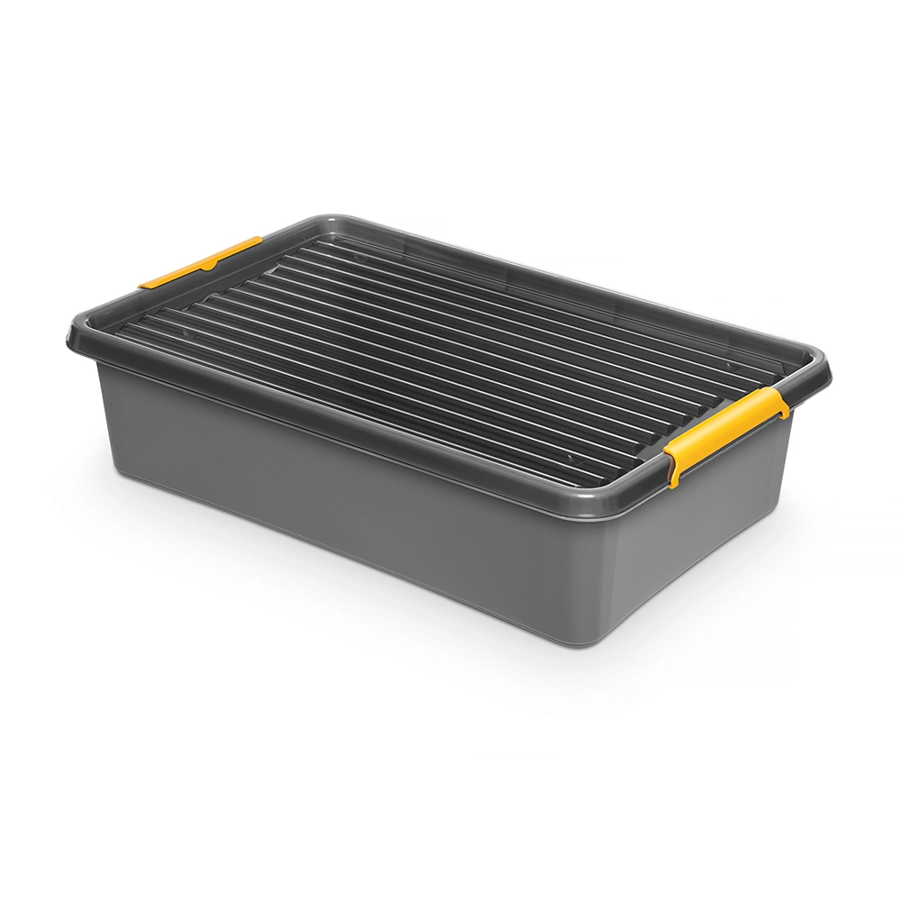 De grijze kleurstelling met opvallende gele clipsluiting geeft een moderne twist aan functionaliteit, terwijl het 'smoked' transparante grijze deksel inhoud zichtbaar maakt zonder aan stijl in te boeten. Maak je geen zorgen meer over rondslingerende gereedschappen of seizoensgebonden uitrusting met deze boxen van Orplast uit de SolidStore collectie; alles krijgt zijn eigen plek in deze stevige opbergbox. En met zijn stootvaste eigenschappen kun je ervan verzekerd zijn dat je bezittingen veilig blijven, zelfs als de box een keer zou vallen. Kortom, dit is dé opbergoplossing die stijl combineert met extreme functionaliteit. Of je nu een professional bent die orde wil scheppen in het magazijn of iemand die thuis extra opbergruimte nodig heeft; onze opbergbox voor heavy duty gebruik staat klaar om elke uitdaging aan te gaan!