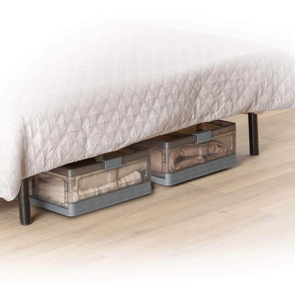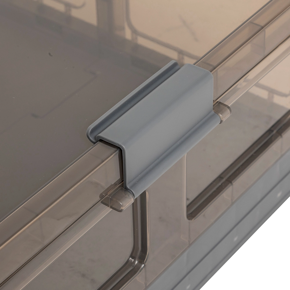 Dankzij de slimme vlinderopening van de twee scharnierende deksels hoef je de box niet volledig te openen, waardoor je eenvoudig toegang hebt tot de inhoud zonder de box helemaal onder het bed vandaan te halen. Deze opbergbox voor onder bed is ontworpen voor gebruiksgemak en efficiëntie. Hij is voorzien van zes stevige clips die zorgen voor een veilige sluiting en wieltjes waarmee je de box moeiteloos kunt verplaatsen. De semi-transparante grijze kleur maakt het mogelijk om de inhoud deels te zien zonder dat het rommelig oogt. Met afmetingen van 80 cm breed, 40,5 cm diep en 18 cm hoog past deze lage opbergbox moeiteloos onder de meeste bedden en bespaart hij waardevolle ruimte in de slaapkamer.