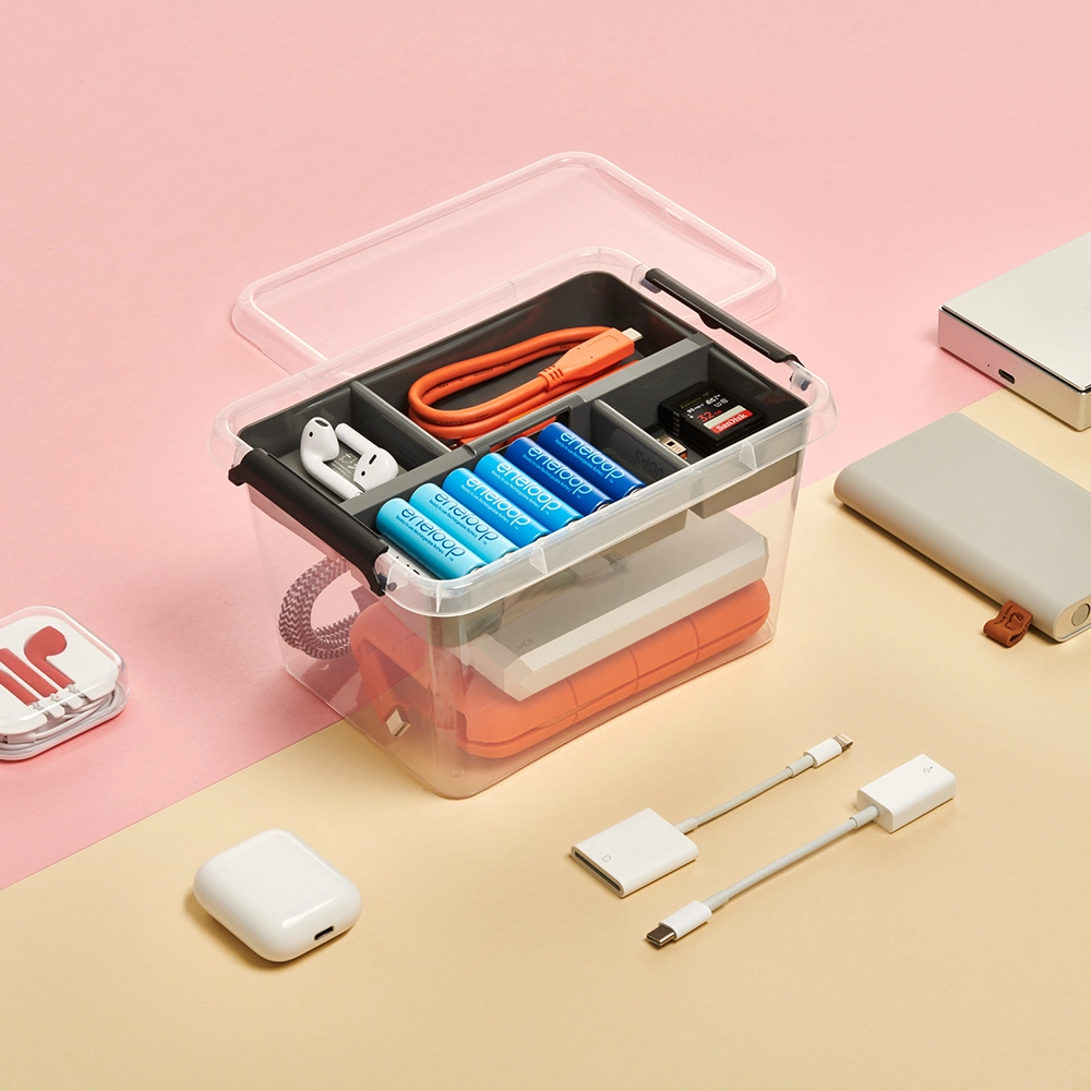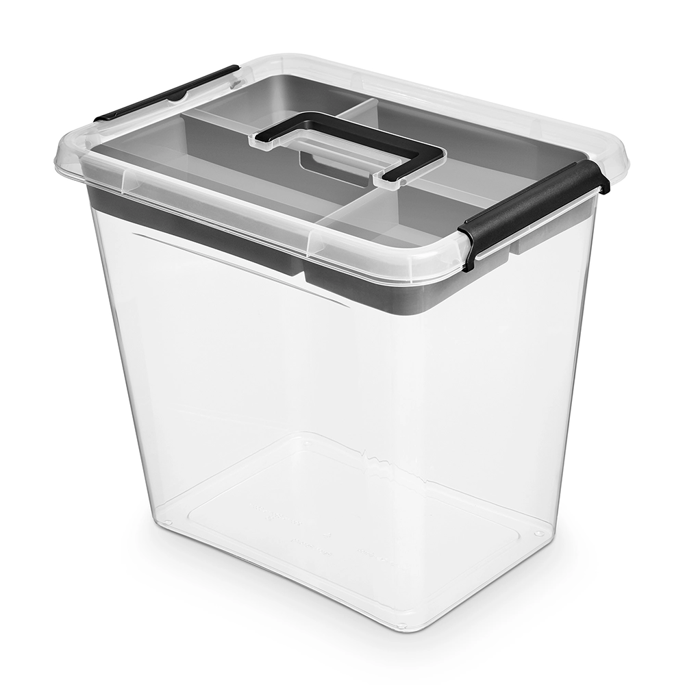 De opbergbox is gemaakt van hoogwaardig polypropyleen, wat zorgt voor een lange levensduur en uitstekende bescherming van je spullen. De stevige clipsluitingen houden de deksel veilig op zijn plek, zelfs tijdens transport. De grijze inzetbak biedt een stijlvol contrast met de transparante box en zorgt voor een moderne, strakke uitstraling. Perfect voor wie zijn spullen georganiseerd en overzichtelijk wil opbergen.