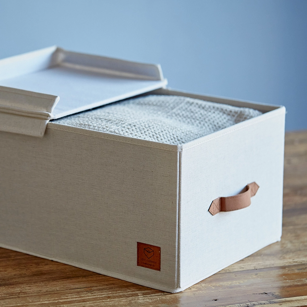 Onze opbergdoos is ontworpen om snel voor orde te zorgen. Beschikbaar in verschillende formaten, bieden deze opbergmanden met deksel voldoende ruimte voor diverse items. Dankzij de handige handgreep van textielleer kan de doos eenvoudig uit de kast worden getrokken en comfortabel worden gedragen. Er is ook een variant met een dubbelzijdig klapdeksel, zodat je kleding kunt pakken zonder de hele deksel te hoeven verwijderen. De opbergdoos is er in drie formaten: