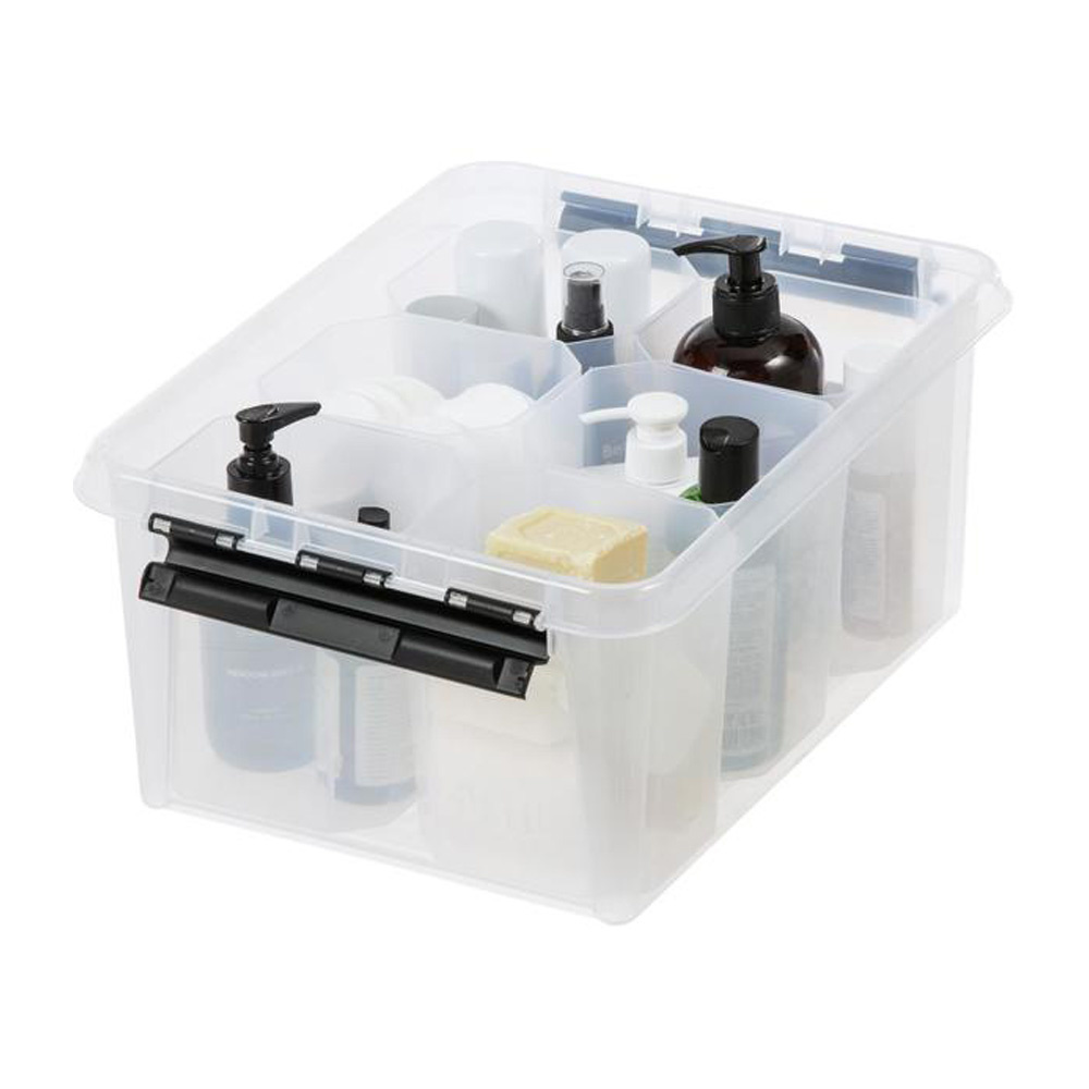 De opbergbox met vakjes is een sterke kwalitatieve bak met uitneembare bakjes in verschillende maten. Het bestaat uit transparante kunststof en heeft stevige zwarte kleppen. Ideaal om losse spullen in op te bergen en te categoriseren! De bakken zijn stapelbaar en beschikbaar in 3 varianten: