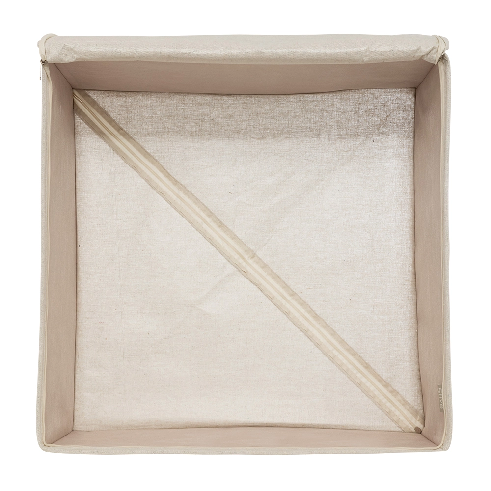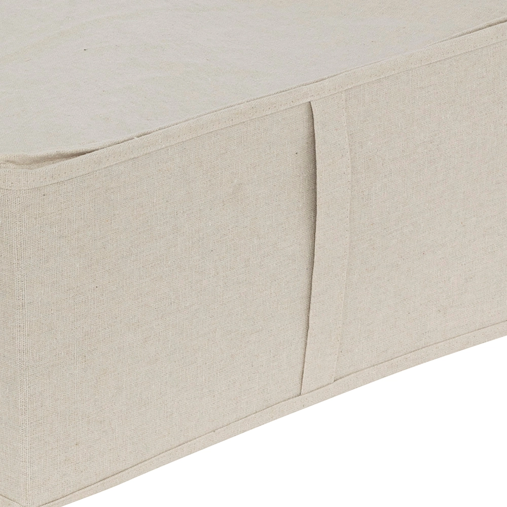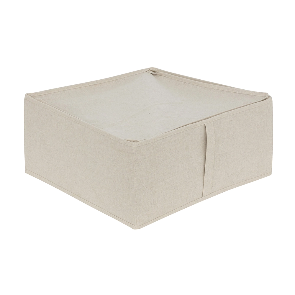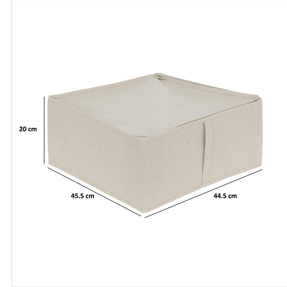 De ventilatiehoek zorgt voor een goede luchtcirculatie, waardoor onaangename geurtjes worden voorkomen en je spullen fris blijven. Deze opberghoes is gemaakt van een combinatie van karton en polyester, wat zorgt voor een stevige maar lichtgewicht constructie. De beige kleur geeft een neutrale en stijlvolle uitstraling, passend in elke slaapkamer of opbergruimte. Met een afmeting van 44,5 cm breed, 45,5 cm diep en 20 cm hoog biedt de hoes voldoende ruimte om bijvoorbeeld dekbedden, kussens of seizoenskleding netjes op te bergen. Het handige handvat aan de zijkant maakt het gemakkelijk om de hoes uit de kast of van onder het bed te schuiven.