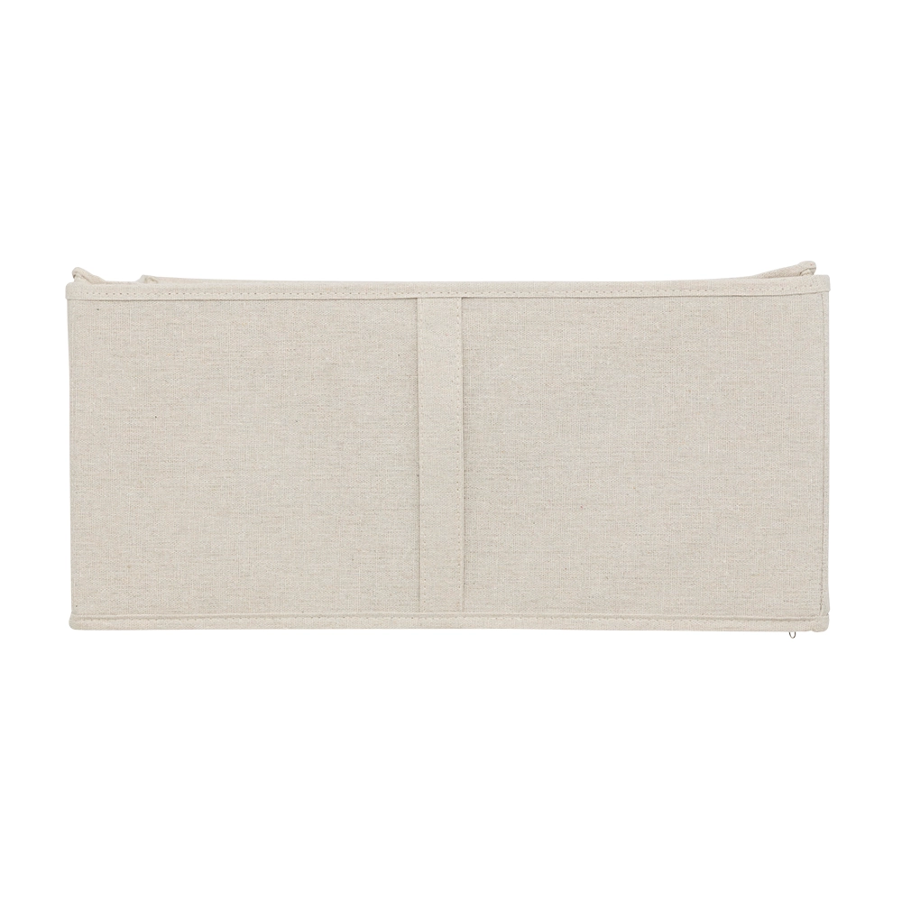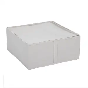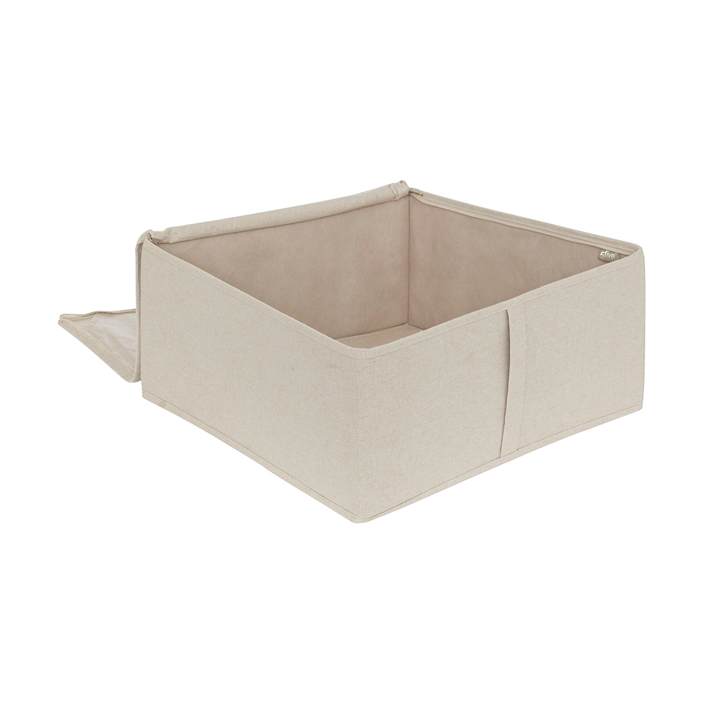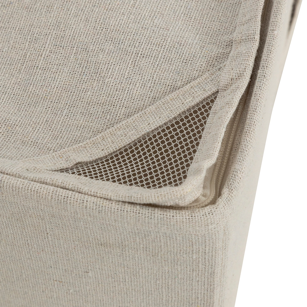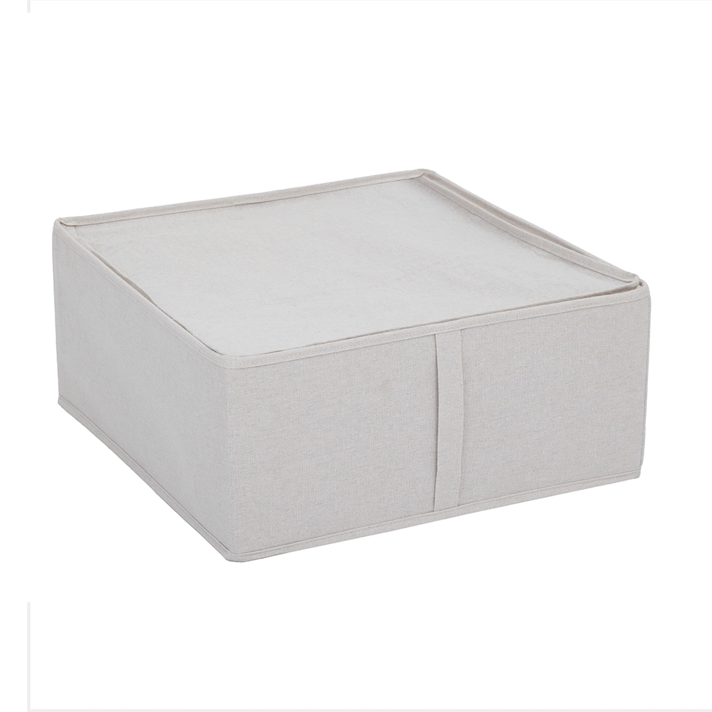 De ventilatiehoek zorgt voor een goede luchtcirculatie, waardoor onaangename geurtjes worden voorkomen en je spullen fris blijven. Deze opberghoes is gemaakt van een combinatie van karton en polyester, wat zorgt voor een stevige maar lichtgewicht constructie. De beige kleur geeft een neutrale en stijlvolle uitstraling, passend in elke slaapkamer of opbergruimte. Met een afmeting van 44,5 cm breed, 45,5 cm diep en 20 cm hoog biedt de hoes voldoende ruimte om bijvoorbeeld dekbedden, kussens of seizoenskleding netjes op te bergen. Het handige handvat aan de zijkant maakt het gemakkelijk om de hoes uit de kast of van onder het bed te schuiven.
