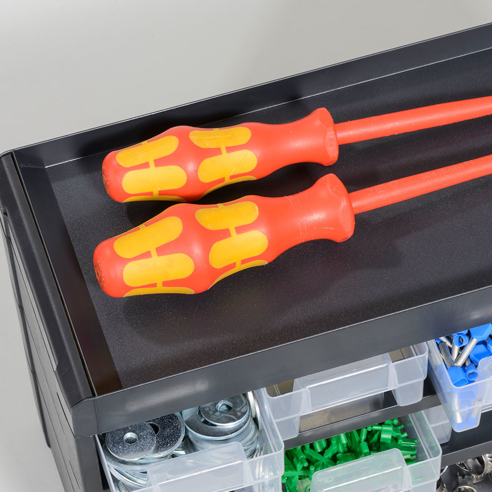 Bekend met een opbergkast in de garage? Deze relatief kleine opberger is werkelijk ideaal voor duizend-en-één kleine accessoires door de vele diverse laatjes en bakjes.