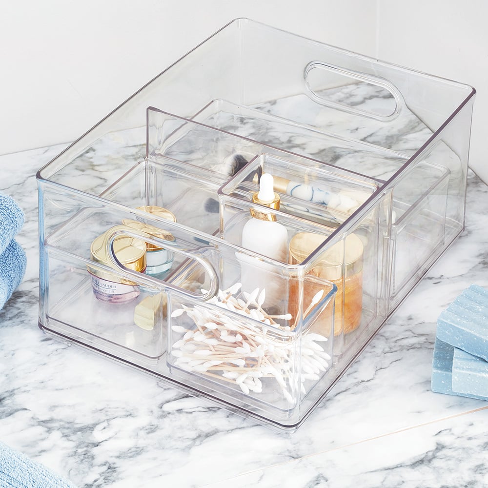 Zorg voor overzicht en orde is jouw badkamer door je make-up, dagelijkse verzorgingsproducten en toebehoren te organiseren in deze opbergbox voor in de badkamer. In deze opbergset van The Home Edit worden alle kleine bakjes geplaatst in de grote opbergbox met twee vakken. Deze box kan je gemakkelijk oppakken en verplaatsen door de handvaten. De make-up bakjes zijn allemaal gemaakt van duurzaam kunststof en zijn stapelbaar. Mocht je deze box niet willen gebruiken in de badkamer? Gebruik hem dan voor op kantoor, de keuken of in de garage.
