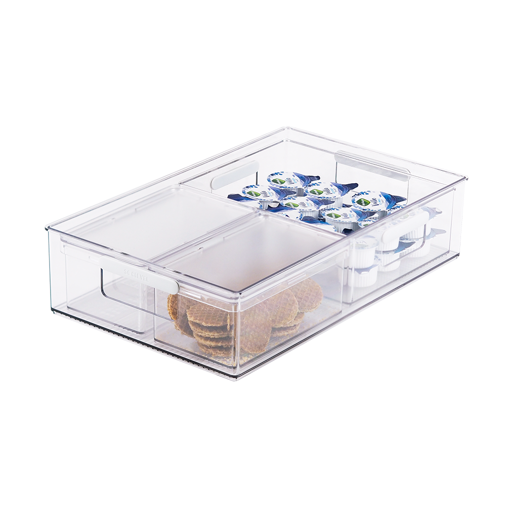Berg je onverpakte koekjes, snoepwaren of andere lekkernijen op in de 2 luchtdichte voorraaddozen en gebruik het open bakje voor verpakte etenswaren. De inzetbakjes zijn uitneembaar waardoor deze ook buiten de set om te gebruiken zijn als opbergbakjes. De gehele set, maar ook de bakjes afzonderlijk, zijn stapelbaar. Creëer overzicht in je keukenkastjes in een handomdraai met deze opbergset van So Clever!