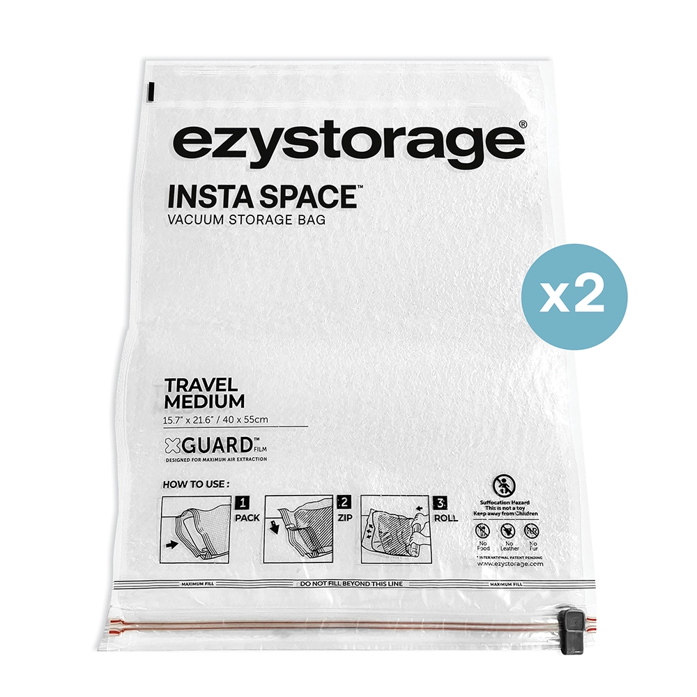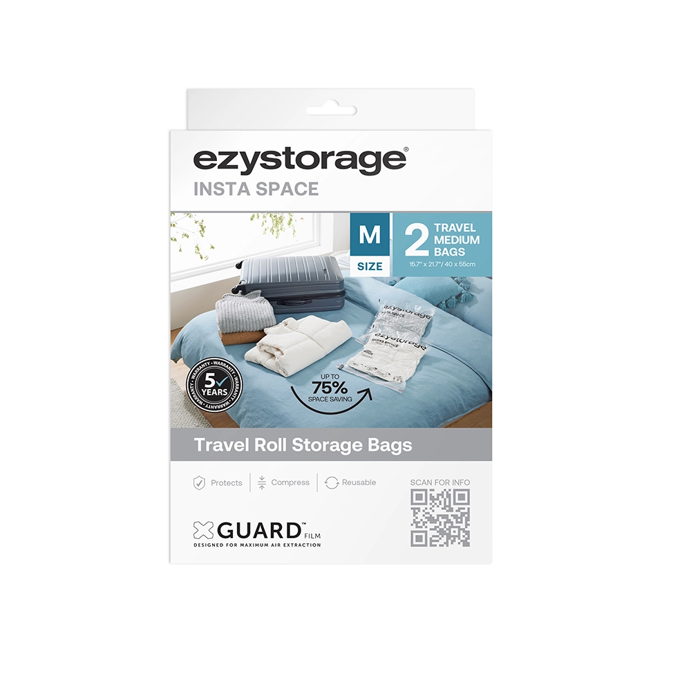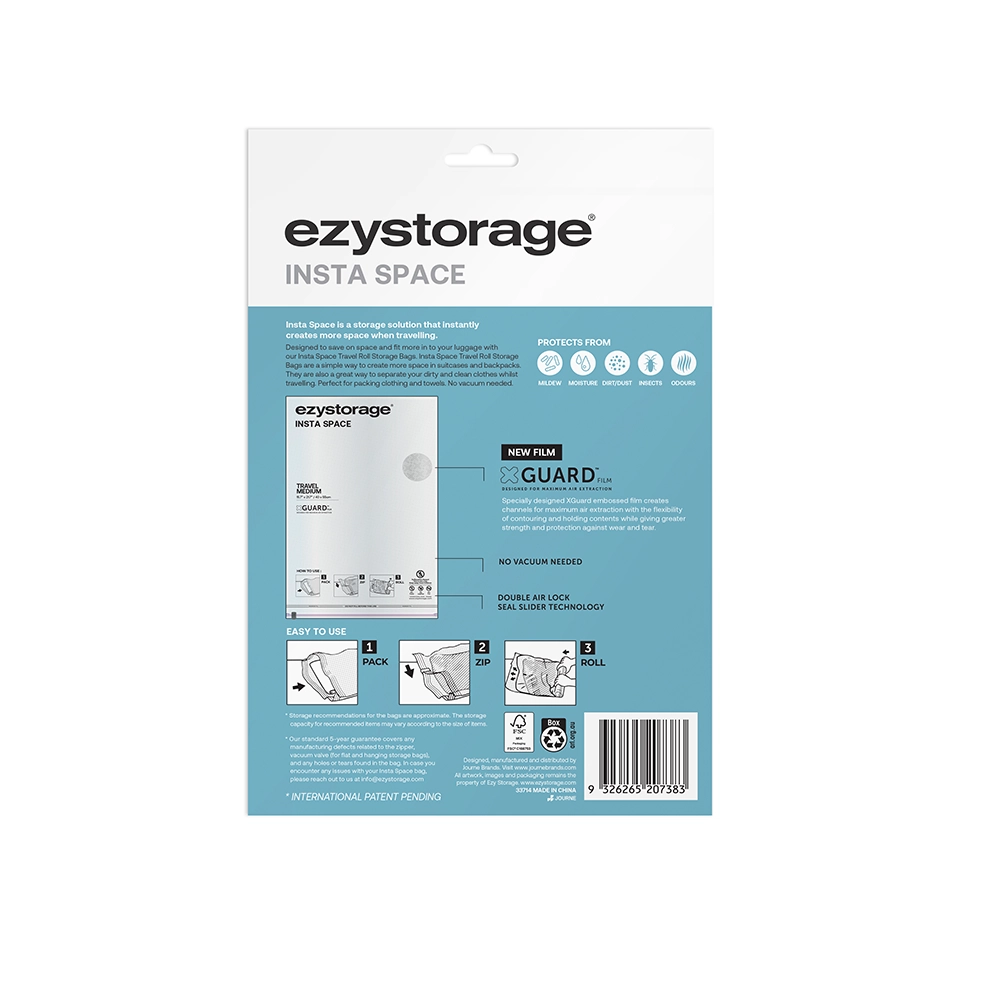 Vervaardigd uit hoogwaardig kunststof, beloven deze oprolbare vacuumzakken niet alleen extra ruimte maar ook bescherming tegen schimmel, water, vuil, insecten en onaangename geurtjes met hun dubbele air lock zip-sluiting technologie. Of je nu een weekendje weg gaat of een lange reis plant, deze vaccuumzakken bieden zowel functionaliteit als gemoedsrust. De Insta Space collectie is verkrijgbaar in diverse maten, waardoor er voor elke behoefte een geschikte vacuumzak is. Perfect voor het opbergen van kleding, handdoeken en andere essentiële benodigdheden die je wilt beschermen en compact willen houden.