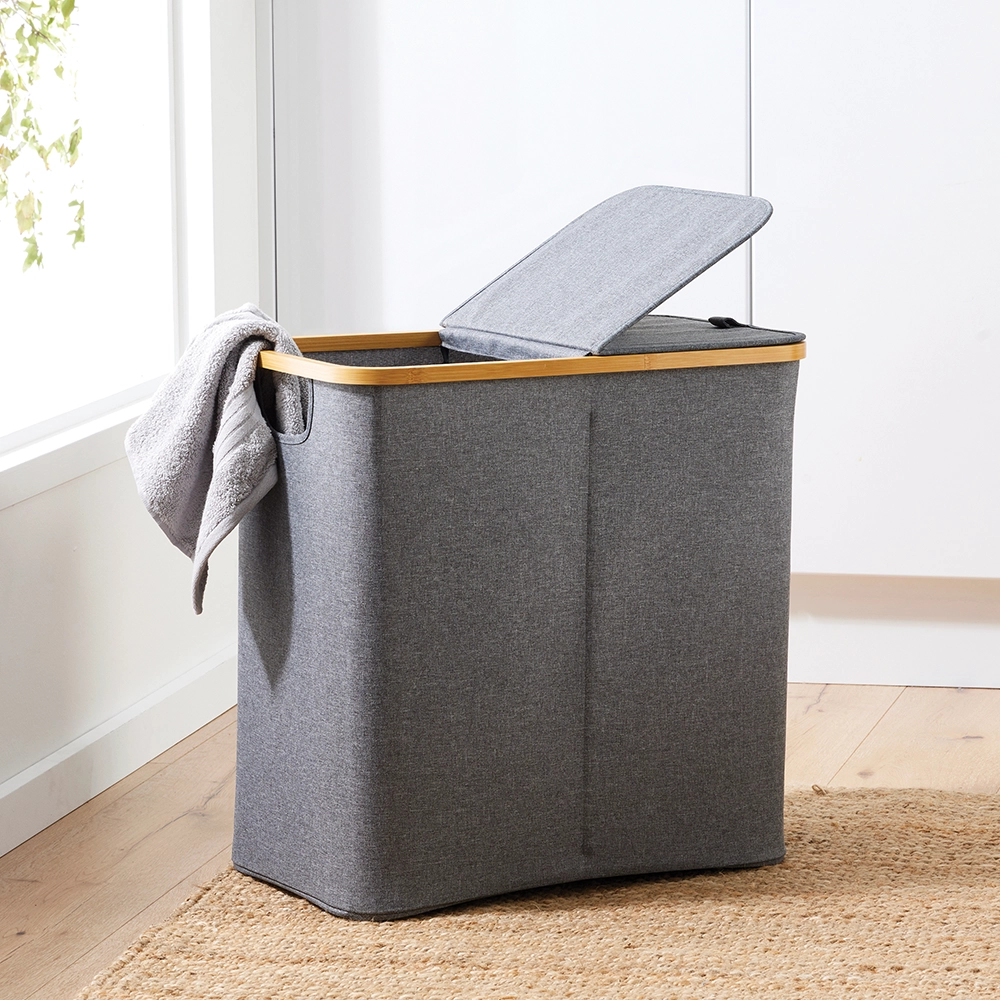 De wasmand met 2 vakken van Ezy Storage is een slimme en stijlvolle oplossing voor het scheiden en organiseren van je wasgoed. Deze wasmand is gemaakt van hoogwaardige stoffen met een elegant bamboe frame, wat zorgt voor een duurzame en moderne uitstraling. Dankzij de twee aparte vakken kun je eenvoudig je wasgoed sorteren, bijvoorbeeld in licht en donker, voor een efficiëntere wasroutine.