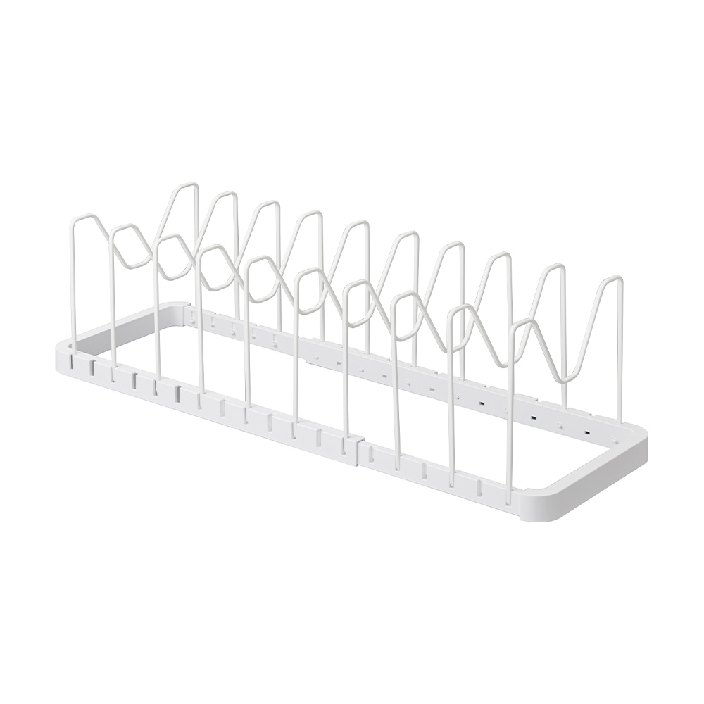 Deze stijlvolle pannenhouder kun je neerzetten in je keukenkast of lade om je pannen en deksels handig mee te sorteren. Het pannenrek is gemaakt van stevig metaal, en daarmee ook geschikt voor zwaardere pannen. Het heeft een afmeting van 45 cm breed, 20 cm diep en 17,5 cm hoog. Het dekselrek is uitschuifbaar in de breedte tot 82 cm, waardoor het in bijna iedere kast of diepe lade past. Het rek is dus verstelbaar naar wens. Er zijn 10 verdelers inbegrepen, die je zelf kunt bevestigen op de gewenste plek. Zo heb je de mogelijkheid om smalle vakken te creëren voor deksels, en brede vakken voor pannen.