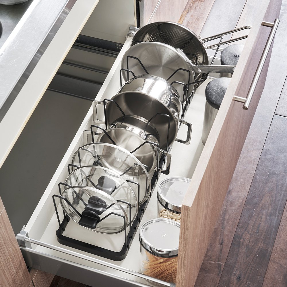 Last van een rommelige keukenkast? Gebruik dan deze dekselhouder van Yamazaki om je pannen en deksels op te bergen. Geef iedere pan en deksel een vaste plek, en bespaar daarmee tijd tijdens het koken!