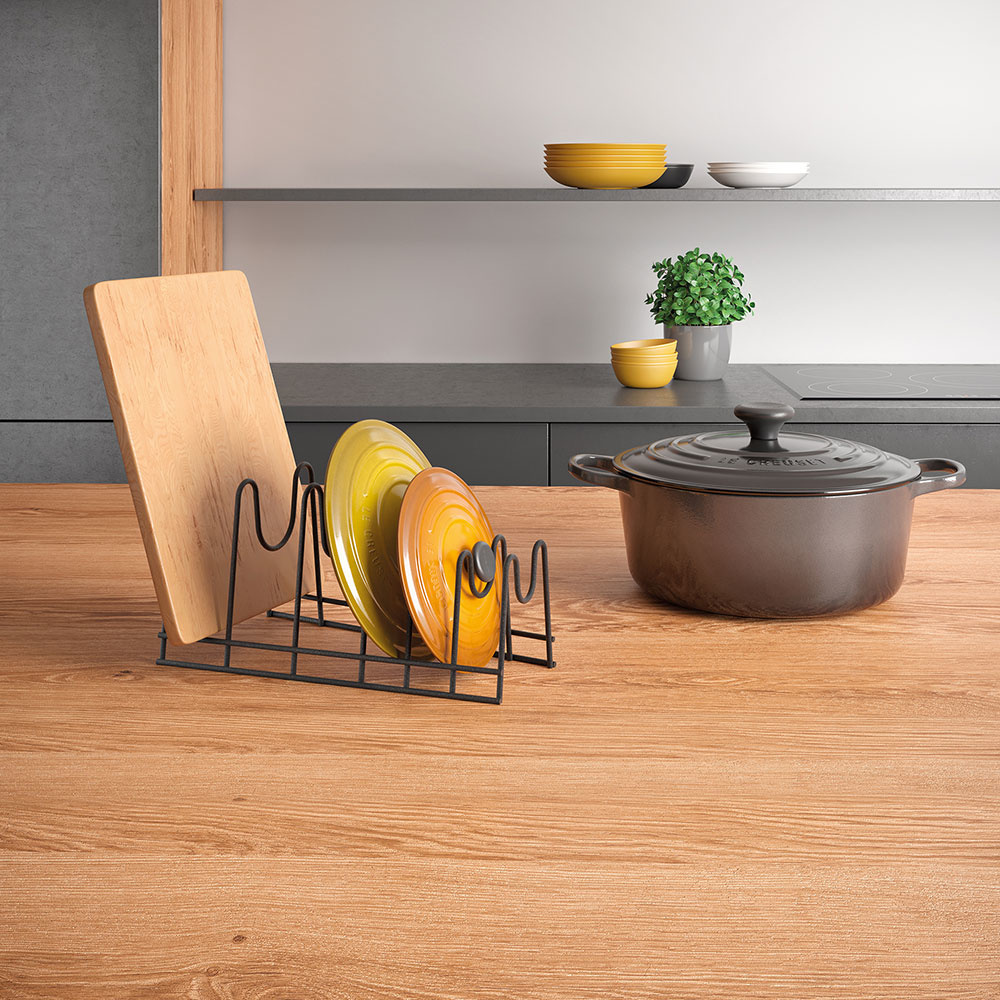 Modern en stijlvol pannendekselrek met plek voor zes pannendeksels. Past perfect in keukenkastjes en is ook geschikt voor borden en snijplanken.