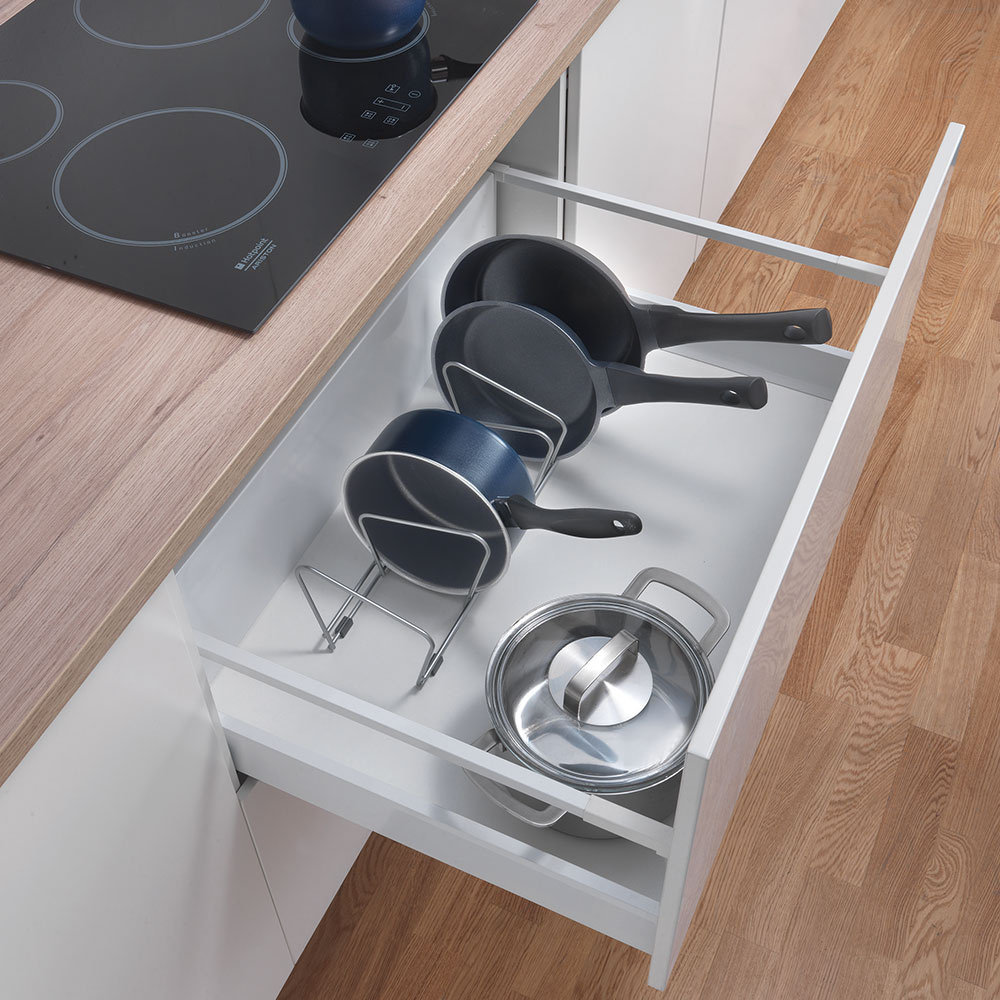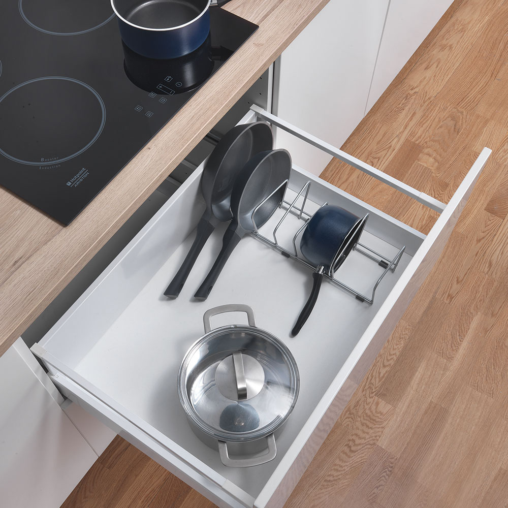 Is het opbergen van je pannen een rommeltje? Dit pannenrek voor in de lade is ideaal voor het opbergen van verschillende soorten pannen.