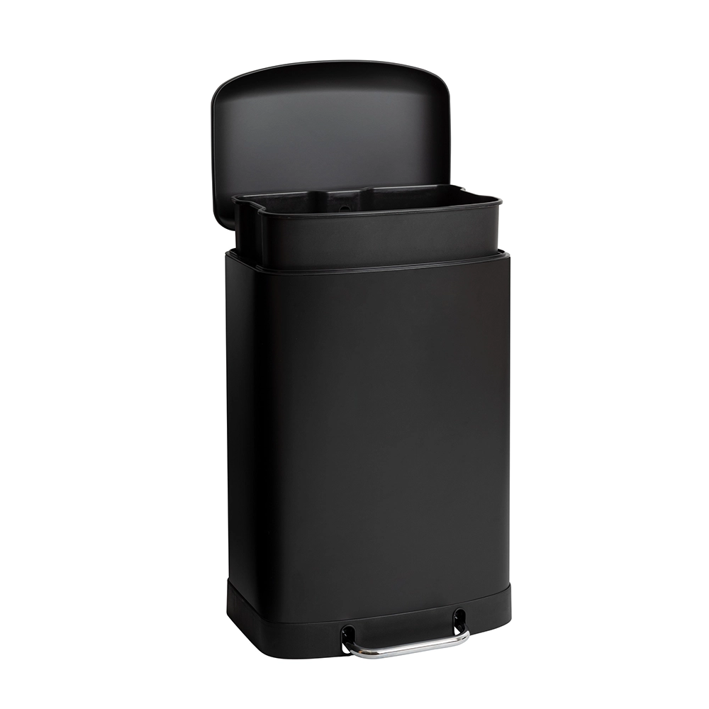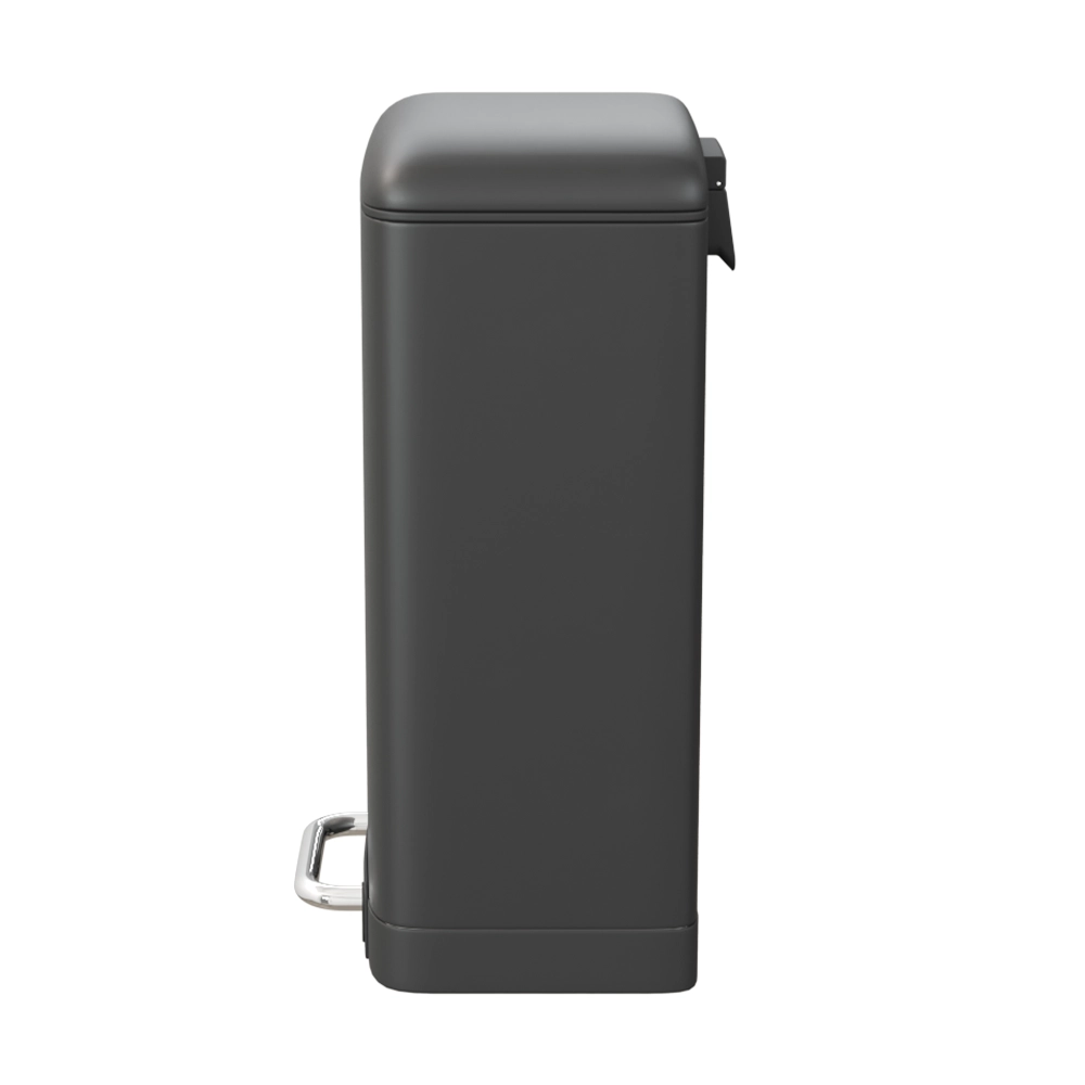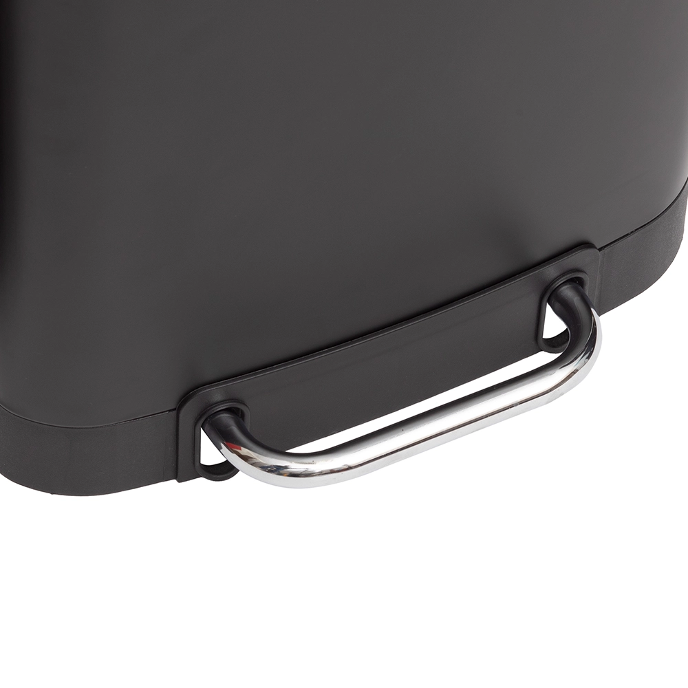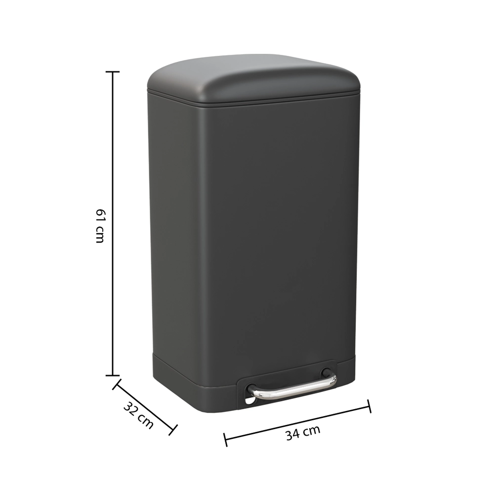 De 30 liter pedaalemmer is voorzien van een soft close mechanisme, waardoor het deksel geruisloos sluit. Geen vervelende harde geluiden meer! De uitneembare emmer met handvat aan de achterkant maakt het gemakkelijk om de prullenbak te legen en schoon te maken. Je kunt ook gebruik maken van vuilniszakken van 30 liter, wat perfect is voor dagelijks gebruik in huis of op kantoor. Deze pedaalemmer is gemaakt van hoogwaardig metaal met een matte coating, wat niet alleen zorgt voor duurzaamheid, maar ook voor een moderne uitstraling. Het gewicht van 4.1 kg zorgt ervoor dat de prullenbak stevig op zijn plaats blijft staan, zelfs als je er wat harder op het pedaal drukt. De afmetingen van de pedaalemmer zijn 34 cm breed, 25 cm diep en 61 cm hoog.