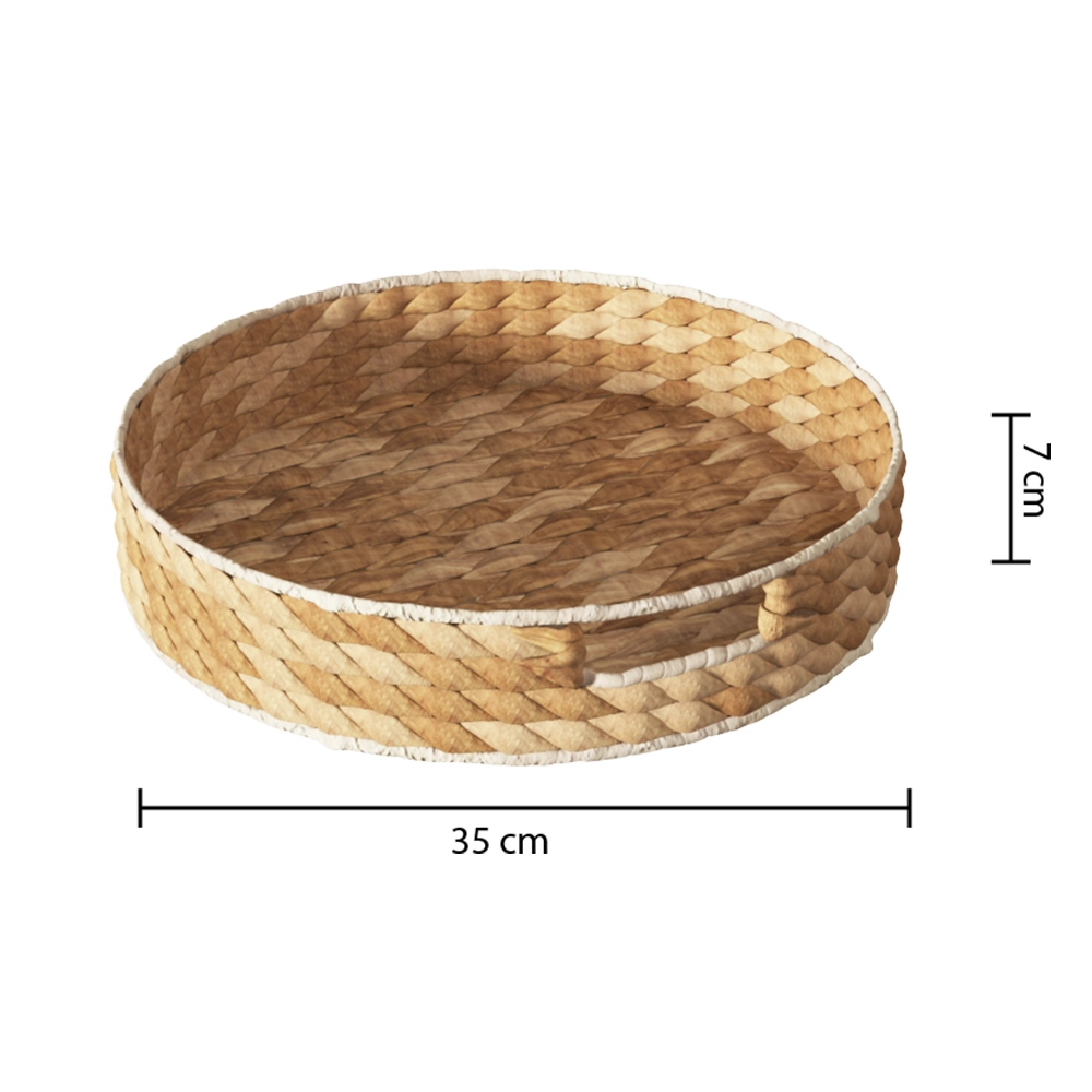 Het ronde dienblad heeft een diameter van 35 cm en een opstaande rand van 7 cm, waardoor het zowel decoratief als praktisch is voor dagelijks gebruik. Het ronde dienblad is niet alleen een mooie toevoeging aan je tafel, maar ook zeer functioneel. Dankzij de twee handvatten aan beide zijden is het dienblad gemakkelijk te dragen, zelfs wanneer het volledig is beladen. Of je het nu gebruikt om drankjes te serveren, als een decoratieve ondergrond voor kaarsen, of om kleine voorwerpen georganiseerd te houden, dit hyacinth dienblad biedt veelzijdigheid in elke setting.