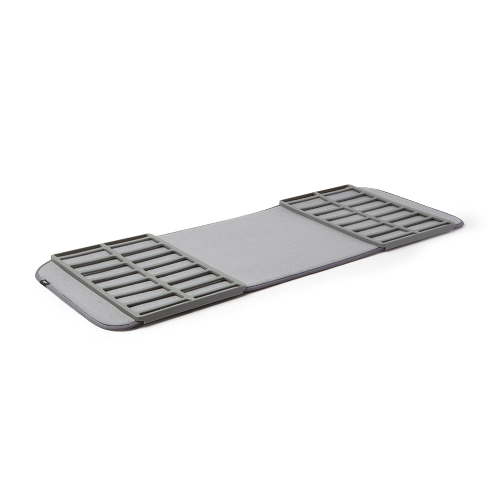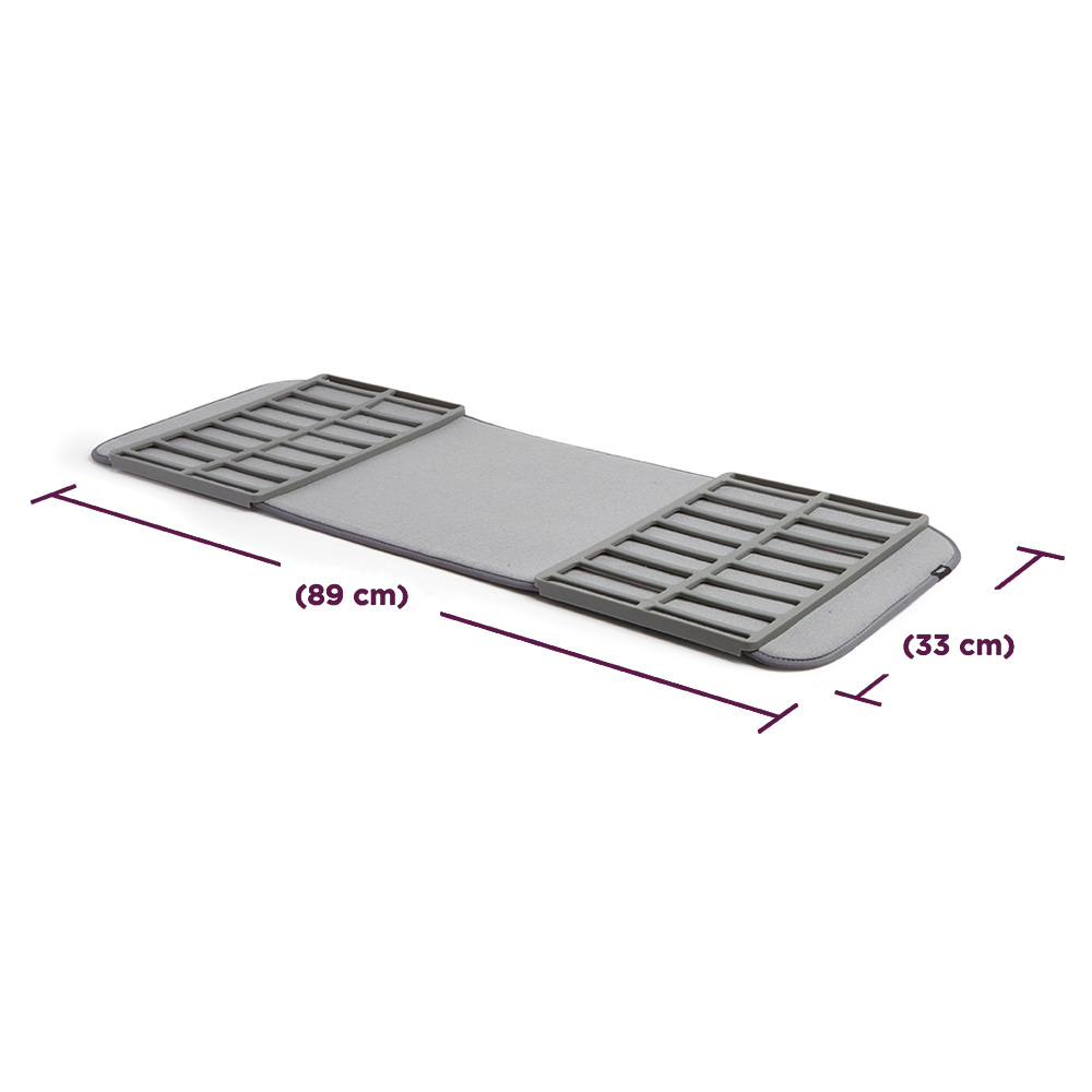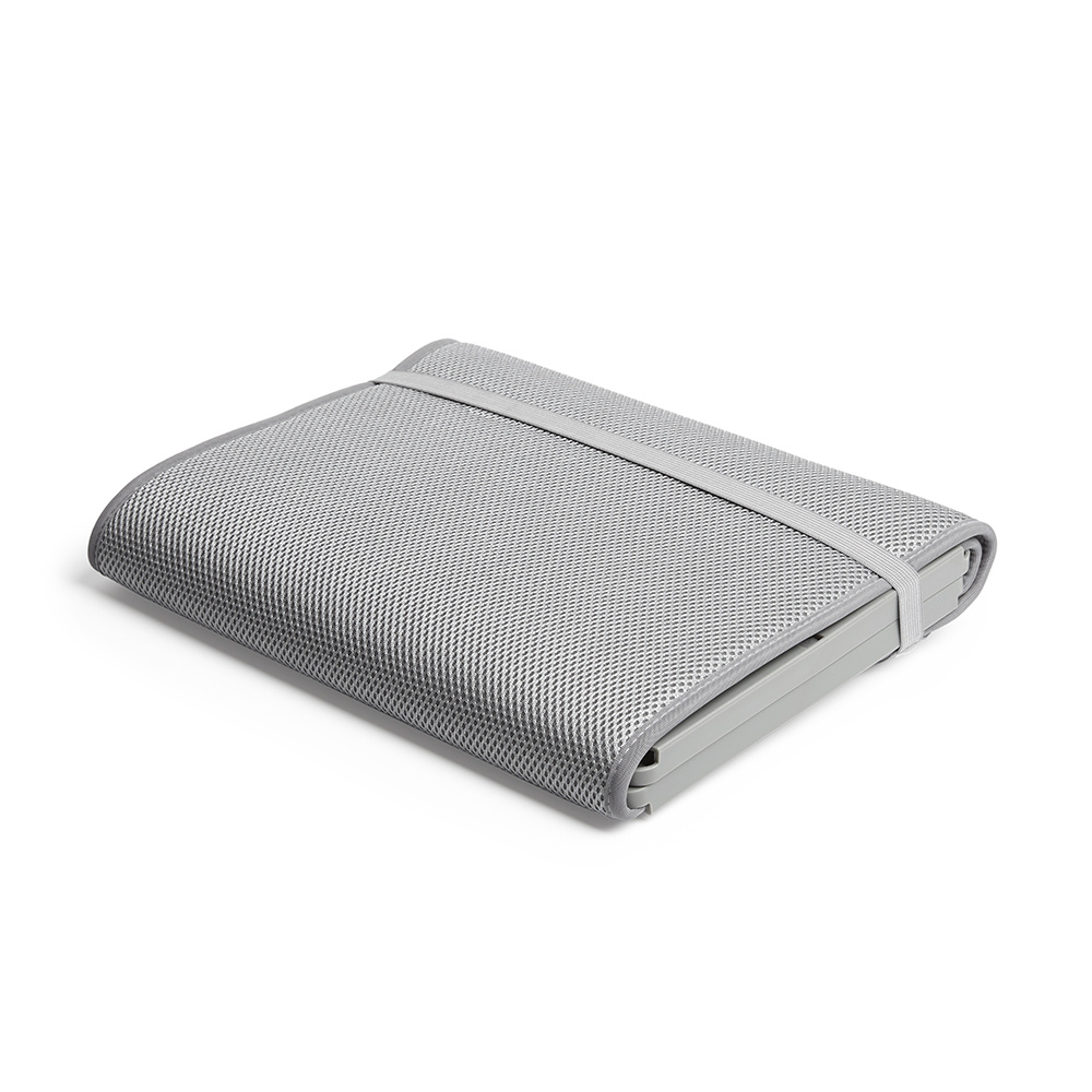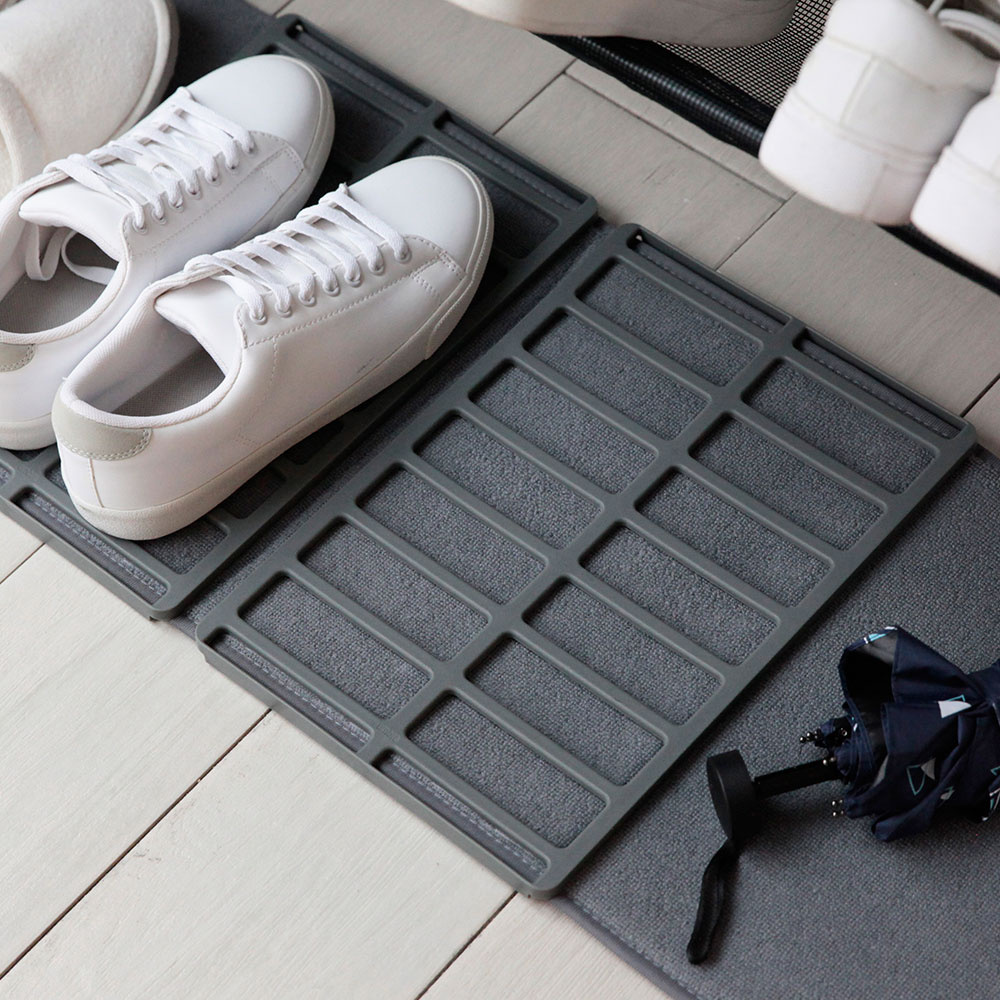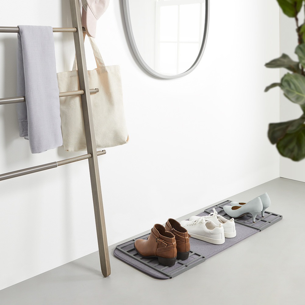 Hoe kan ik mijn natte schoenen het beste opbergen? Met deze handige schoenenmat van Umbra hoef je je geen zorgen meer te maken over natte vloeren en langdurig natte schoenen. Dankzij het ultra-absorberende schuimstof en de rubberen constructie wordt het water gemakkelijk afgevoerd en krijgt lucht de kans om onder je schoenen te circuleren. Het verwijderbare rubberen rekje tilt je schoenen iets van de ondergrond op, waardoor het droogproces nog sneller verloopt. Verder kan de stoffen mat eenvoudig in de machine worden gewassen, zodat je hem altijd fris en schoon kunt houden! Als je de droogmat even niet nodig hebt, kun je hem weer compact opvouwen en handig opbergen.