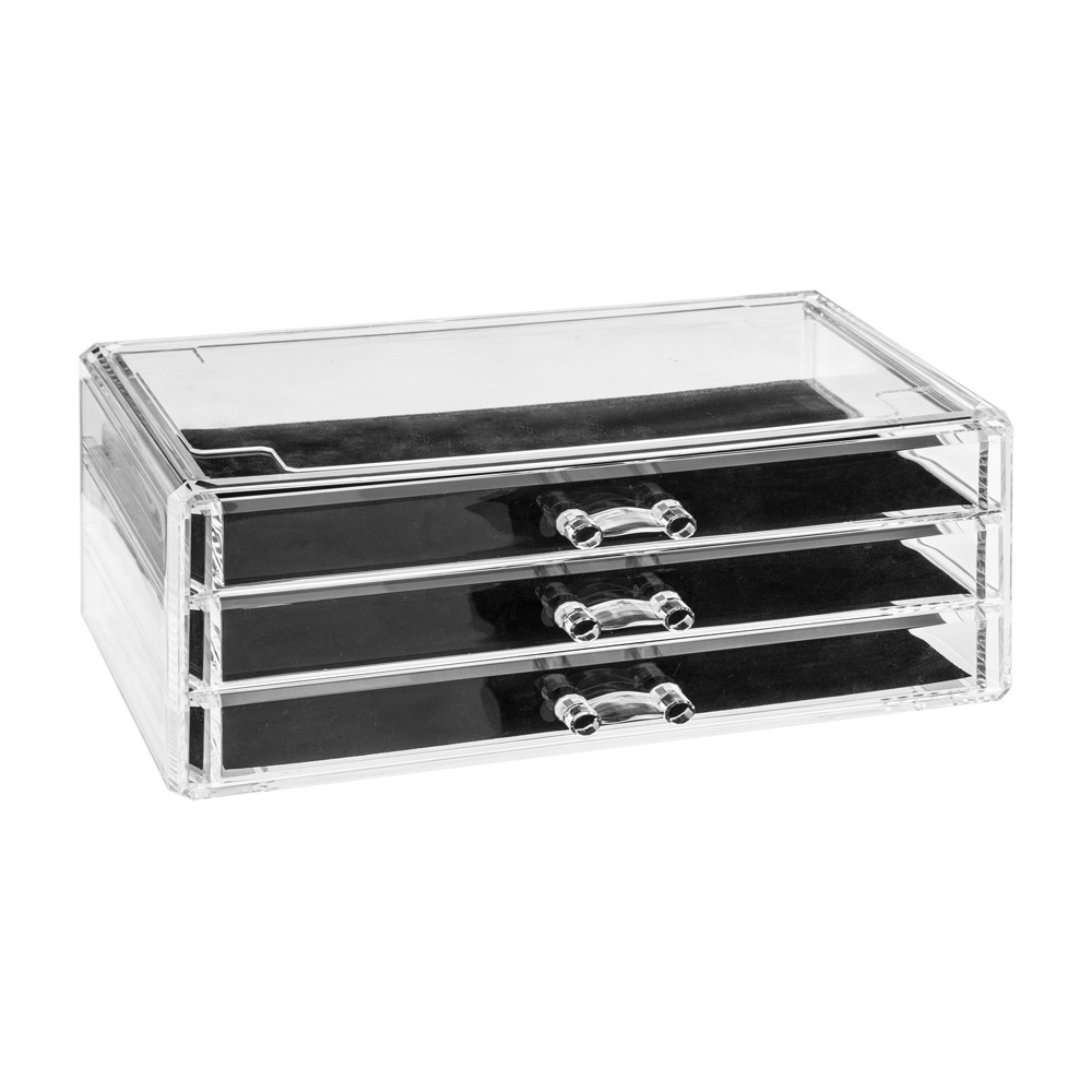 Altijd al op zoek geweest naar een opberger voor make-up of sieraden? Zoek dan niet verder! Deze beauty organizer is gemaakt van acryl kunststof en is volledig transparant, ideaal om al je spullen overzichtelijk te zien liggen. Het sieraden kastje met lades is er in 3 uitvoeringen met dezelfde afmetingen van 23,5 cm breed, 15,5 cm diep en 11 cm hoog.