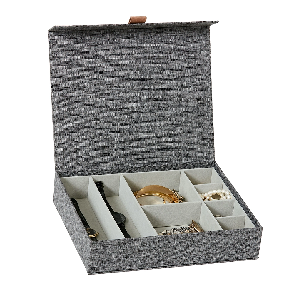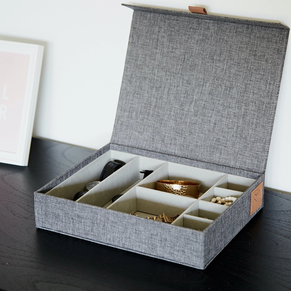 Onze sieradendoos is met grote zorg ontworpen om zowel dagelijks gebruik als esthetische aantrekkingskracht te bieden. Bekleed met hoogwaardig linnen en een fluwelen binnenkant, beschermt deze sieradendoos je sieraden tegen stof en beschadigingen. De binnenkant is voorzien van 8 vakken in verschillende maten, perfect voor het opbergen van alles van horloges tot kettingen en ringen. De doos is verstevigd met MDF hout, wat niet alleen zorgt voor duurzaamheid maar ook de mogelijkheid biedt om als transportdoos gebruikt te worden dankzij de veilige magneetsluiting.