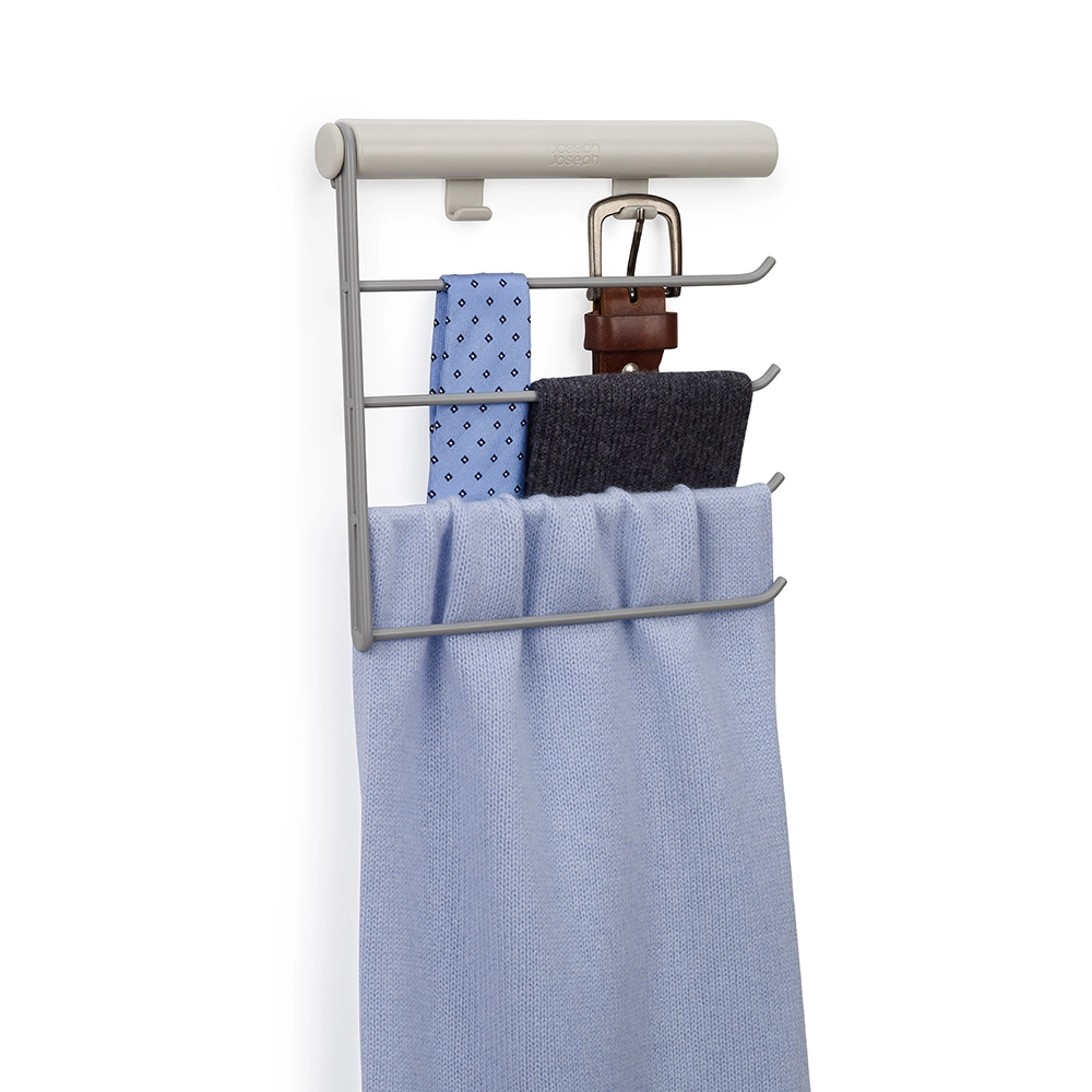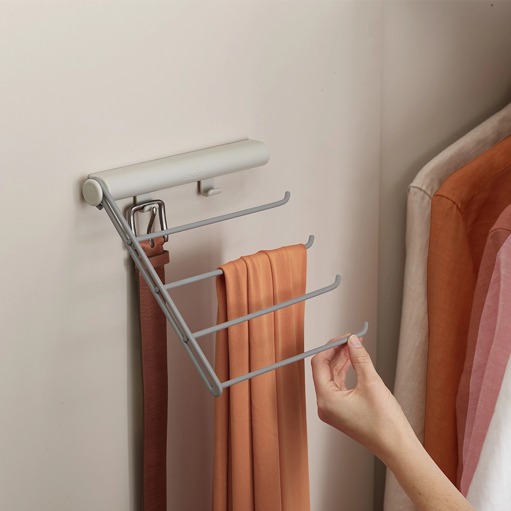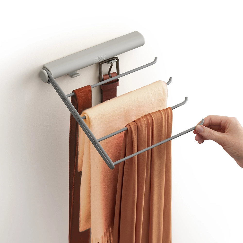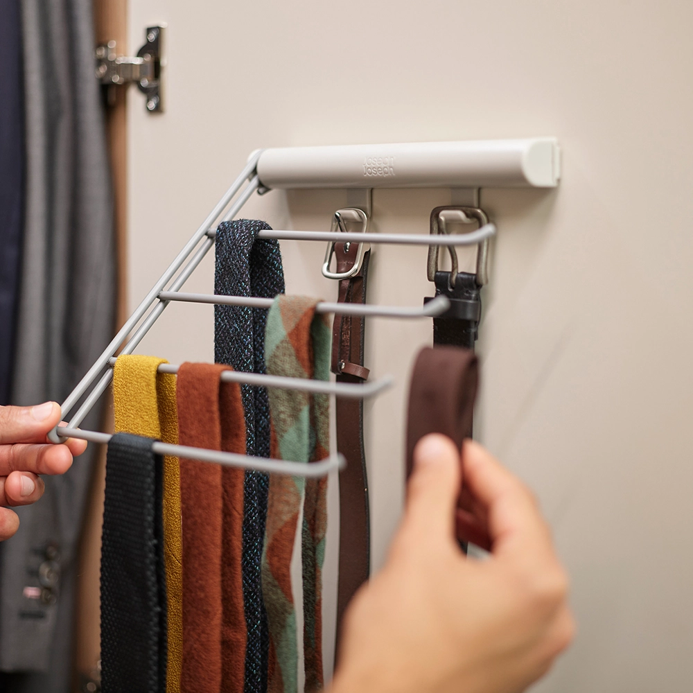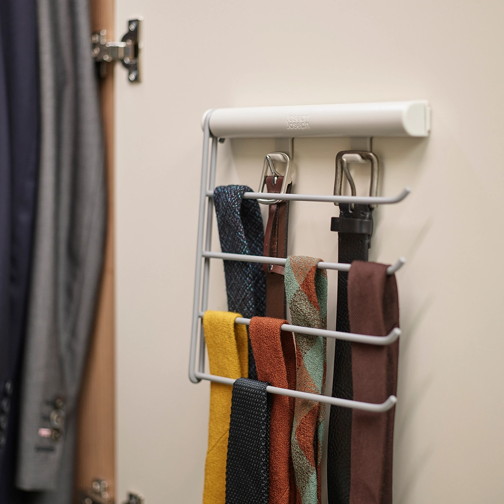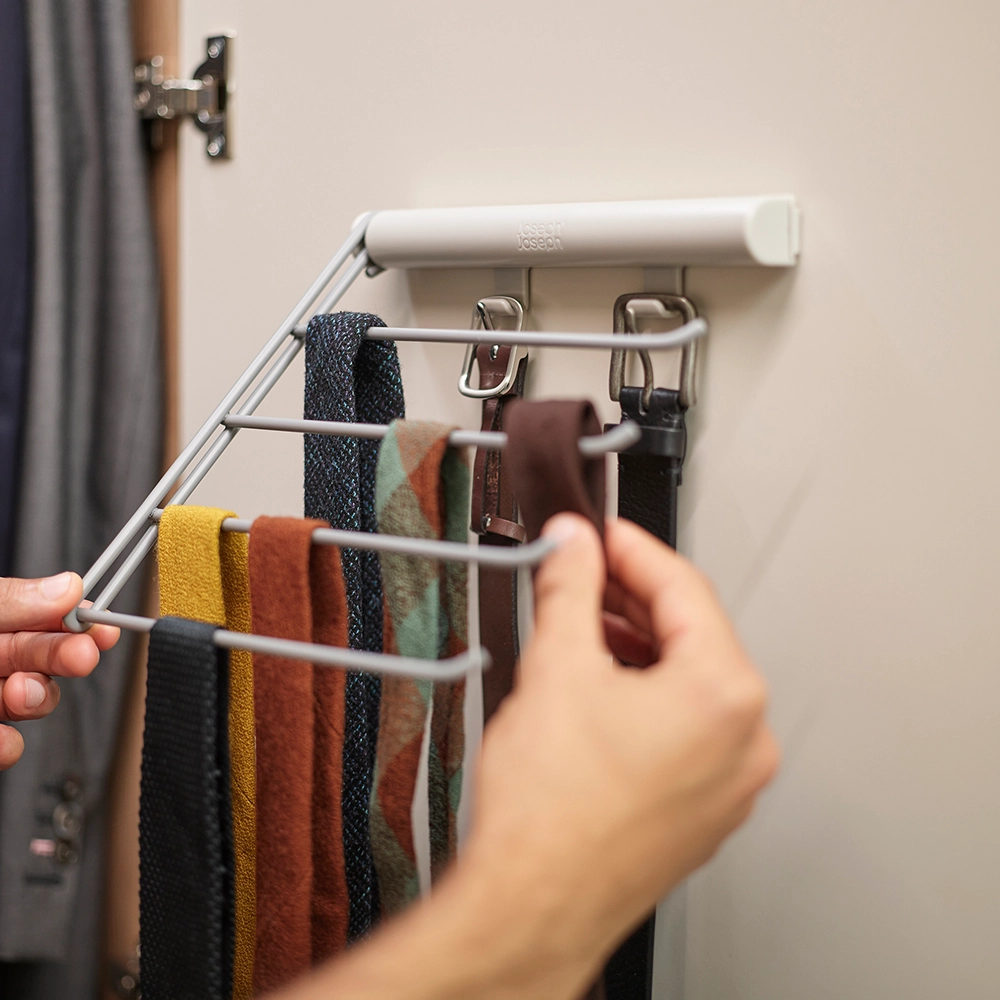 De sjaal, riem en stropdashouder van Joseph Joseph biedt een slimme en ruimtebesparende oplossing voor het organiseren van accessoires zoals stropdassen, riemen en sjaals. Met een innovatief ontwerp dat plat tegen het montagesoppervlak ligt, houdt deze organizer je accessoires overzichtelijk en binnen handbereik.