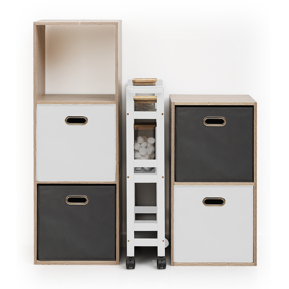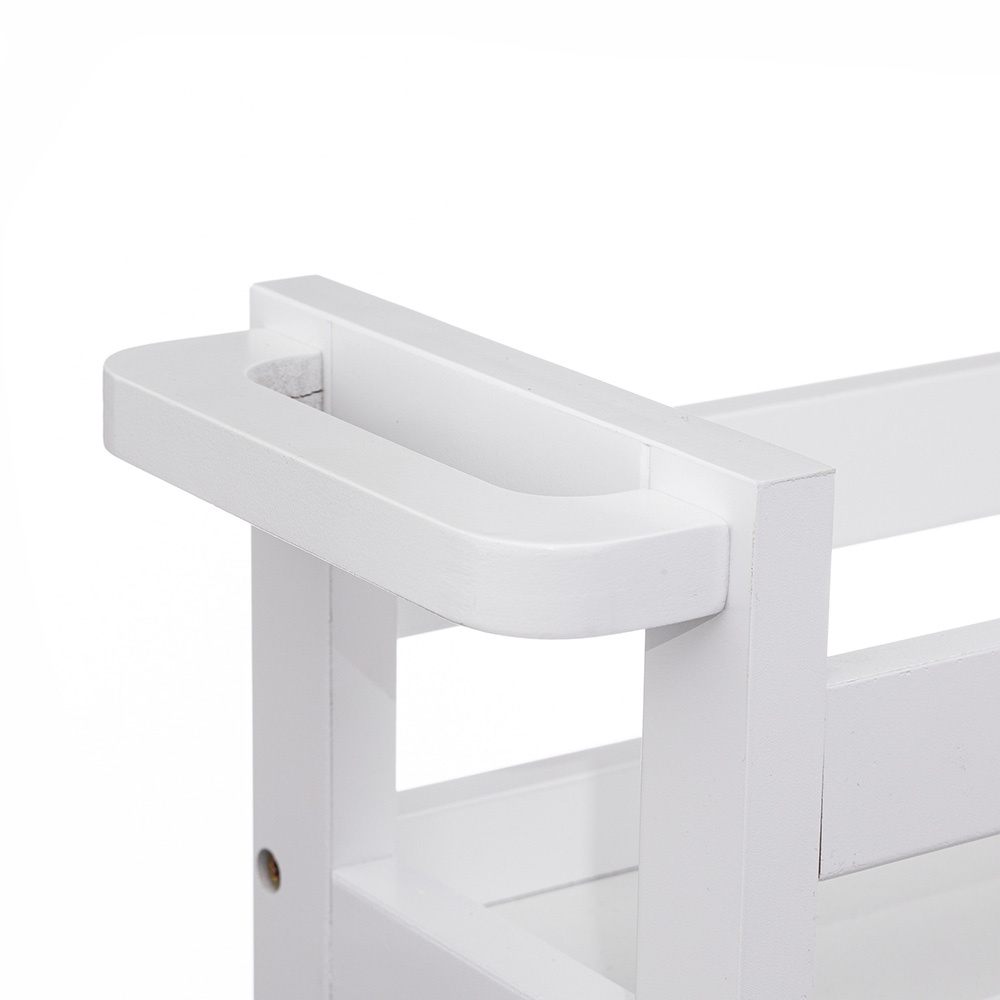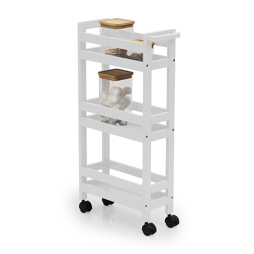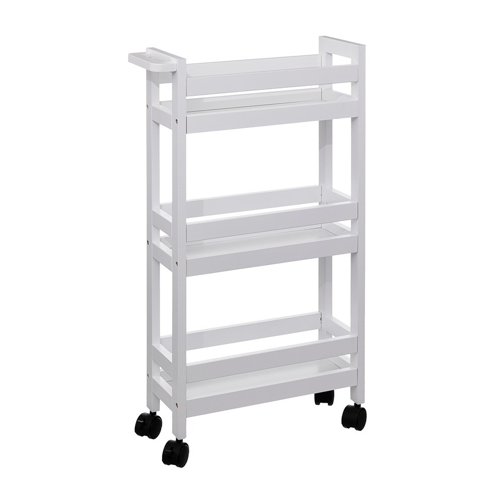 Deze smalle trolley is gemaakt van MDF hout. Deze organizer bestaat uit drie mandjes en eronder zitten vier kunststof wieltjes. De smalle keukentrolley is eenvoudig te monteren en beschikbaar in de kleuren zwart, wit en bamboe. De trolley is 15 cm breed, 40 cm diep en 75 cm hoog.
