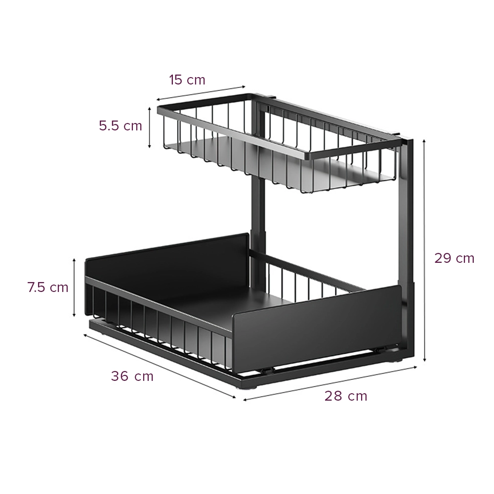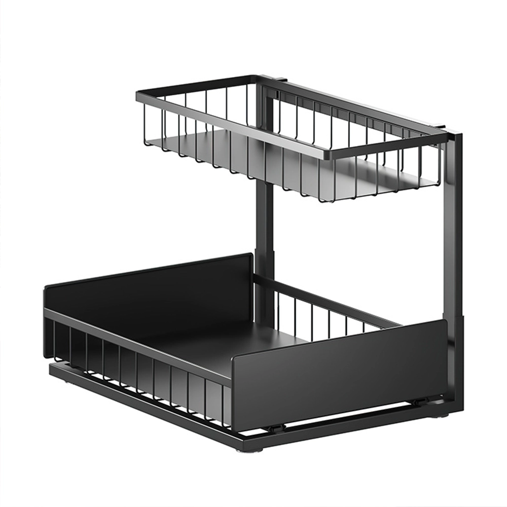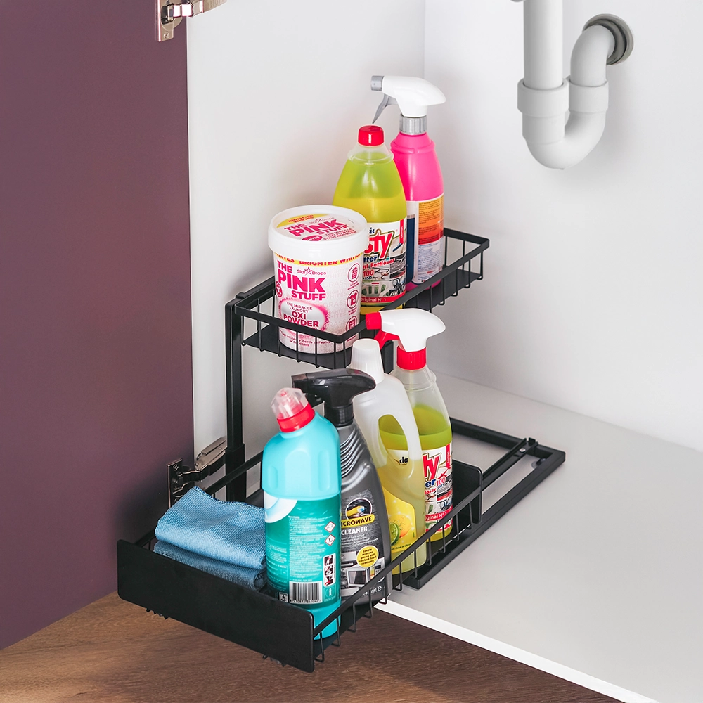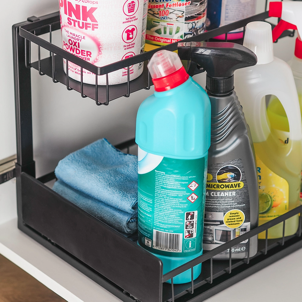Deze hoogwaardige gootsteenkast organizer is gemaakt van duurzaam staal, biedt een stevige en praktische manier om schoonmaakmiddelen, flessen en andere keukenspullen netjes te organiseren. Dankzij het compacte ontwerp en de slimme indeling past het perfect onder de gootsteen, waardoor je optimaal gebruik maakt van de beschikbare ruimte. Dit gootsteenkast rekje is eenvoudig te monteren zonder gereedschap en binnen enkele minuten klaar voor gebruik. De soepele rails zorgen ervoor dat het onderste mandje gemakkelijk uitschuift, terwijl het bovenste mandje afneembaar is voor extra flexibiliteit.