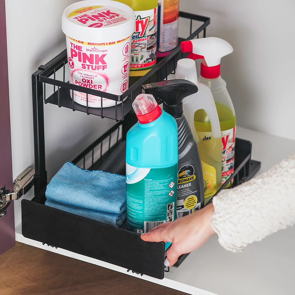 Het gootsteenkast rekje van So Clever is het rekje wat door professionals als beste uit de test kwam. Een slimme oplossing om je (gootsteen)kastje overzichtelijk en efficiënt in te richten met een zeer soepel uitschuifbaar onderste mandje en een stevige constructie die vanwege de zuignap bevestiging niet gaat schuiven.