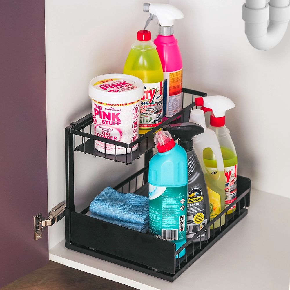 Het gootsteenkast rekje is niet alleen stevig en functioneel, maar ook voorzien van een slimme zuignapbevestiging. Door de zuignappen licht vochtig te maken en op de gewenste plek in je keukenkast te drukken, blijft het rekje stevig op zijn plaats en glijdt het niet weg bij gebruik. Of je het nu gebruikt als uitschuifbaar rek voor in een keukenkast waar je jouw schoonmaakmiddelen in opbergt of als badkamer rekje voor je cosmetica en shampooflessen.