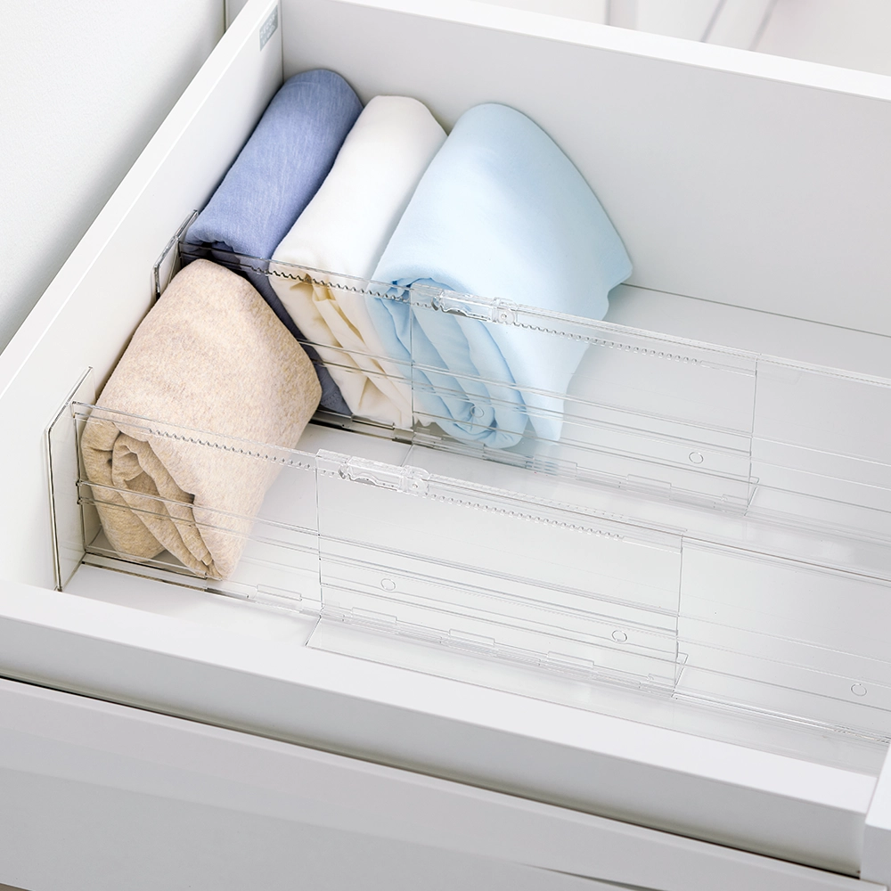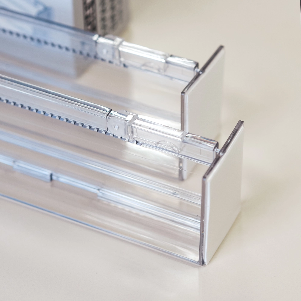 Dankzij het uitschuifbare ontwerp passen deze verdelers moeiteloos in lades met een breedte van 35,5 tot 61,4 cm en zijn ze beschikbaar in twee hoogtes: 6,4 cm en 11,5 cm. Deze ladeverdeler is gemaakt van hoge kwaliteit, transparant PET kunststof en zorgt ervoor dat de inhoud van je lade altijd zichtbaar en toegankelijk blijft. Dankzij de nano tape aan beide uiteinden en een vergrendelingsmechanisme blijven de verdelers stevig op hun plek, zonder te verschuiven bij dagelijks gebruik. Dit maakt ze ideaal voor het sorteren van bestek, kantoorbenodigdheden, make-up of andere kleine items, terwijl je lade netjes en geordend blijft.