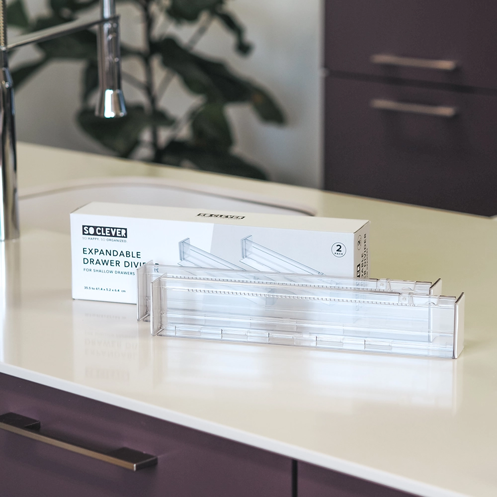 De ladeverdeler van So Clever (set van 2 stuks) biedt een slimme en aanpasbare oplossing om lades georganiseerd en overzichtelijk te houden. Ontworpen met input van professionele organizers, is deze set perfect voor het creëren van een gestructureerde lade indeling in keukenlades, kantoorladen, kledingkasten en meer.