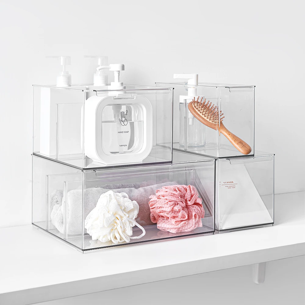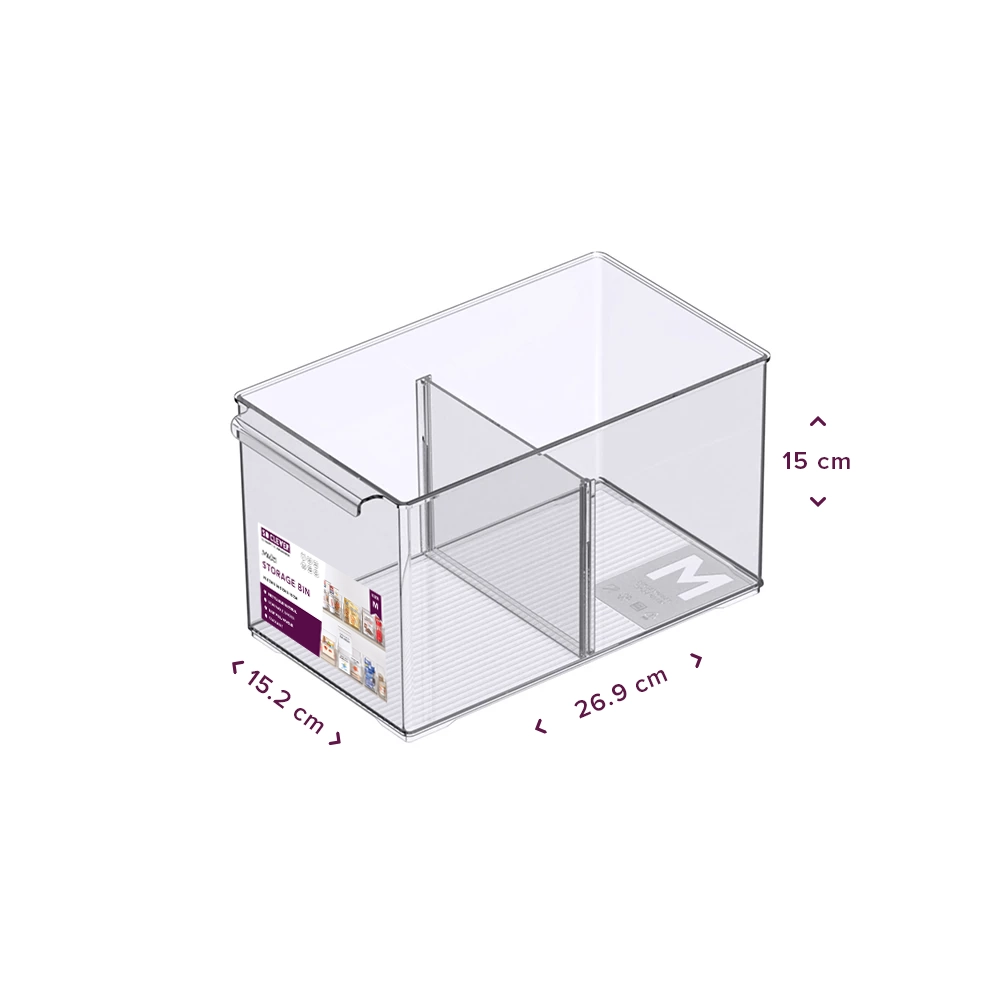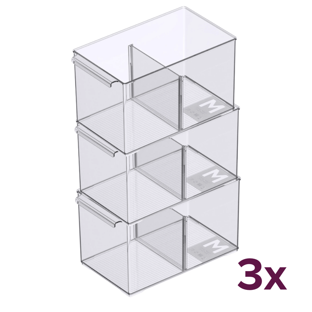 Het transparante opbergbakje is gemaakt van kunststof en is BPA-vrij. Dit maakt het voedselveilig voor het bewaren van onverpakte etenswaren. Het bakje kenmerkt zich door de uitneembare verdelers waarmee je vakken creëert of juist verwijderd. Deze veelzijdige organizer is echter niet beperkt tot enkel de keuken. Ook andere items zoals make-up of kantoorbenodigdheden kan je er in kwijt. De handvaten maken het makkelijk verplaatsbaar. Ook geldt er een garantie van maarliefst 12 maanden op deze bakjes. Je hebt de keuze uit 4 formaten met allemaal dezelfde hoogte en dieptemaat maar welke wel verschillen in breedte: Small, Medium, Large en Extra Large. De kleinste formaten hebben 1 uitneembare verdeler terwijl de grootste variant plek biedt voor 2 uitneembare verdelers. Alle opbergbakjes zijn stapelbaar en te combineren met elkaar. Er is ook een diepere variant beschikbaar met een dieptemaat van 37.1 cm. De afmetingen van deze varianten zijn als volgt: