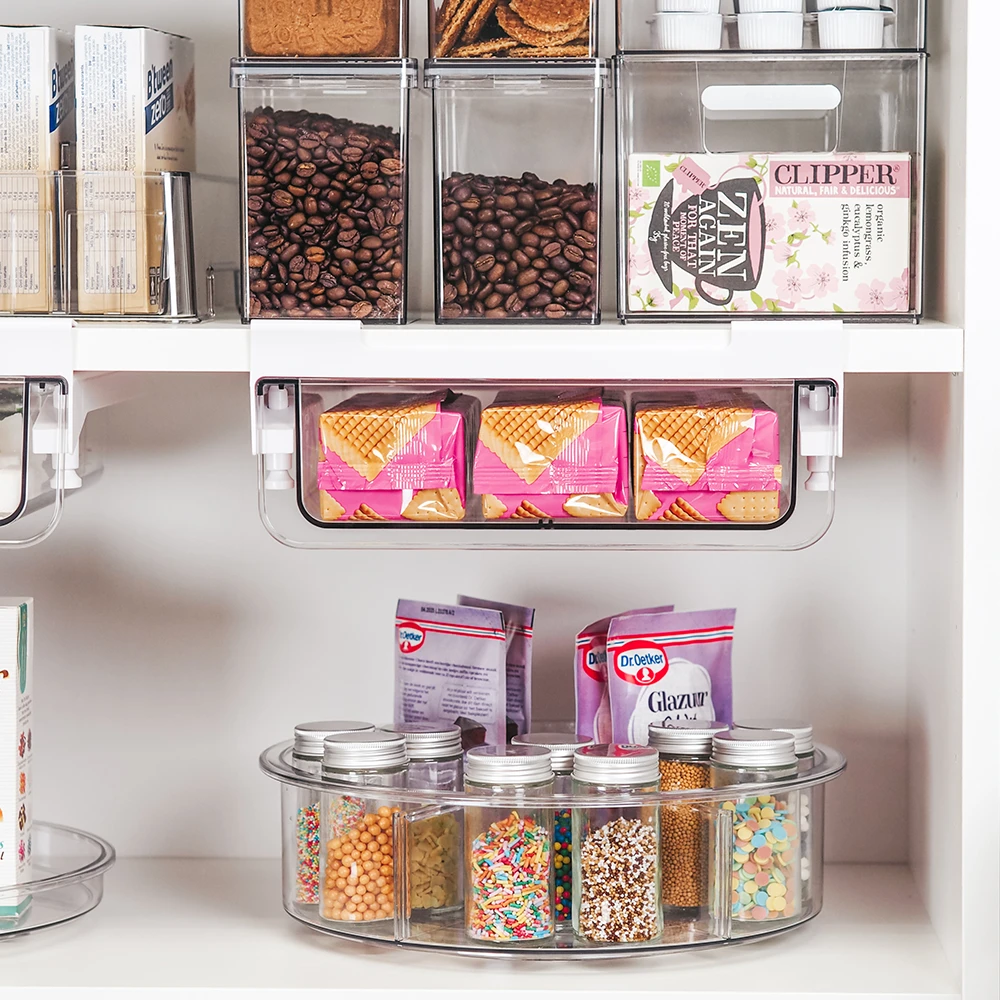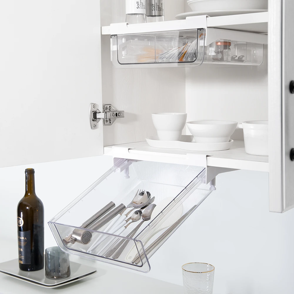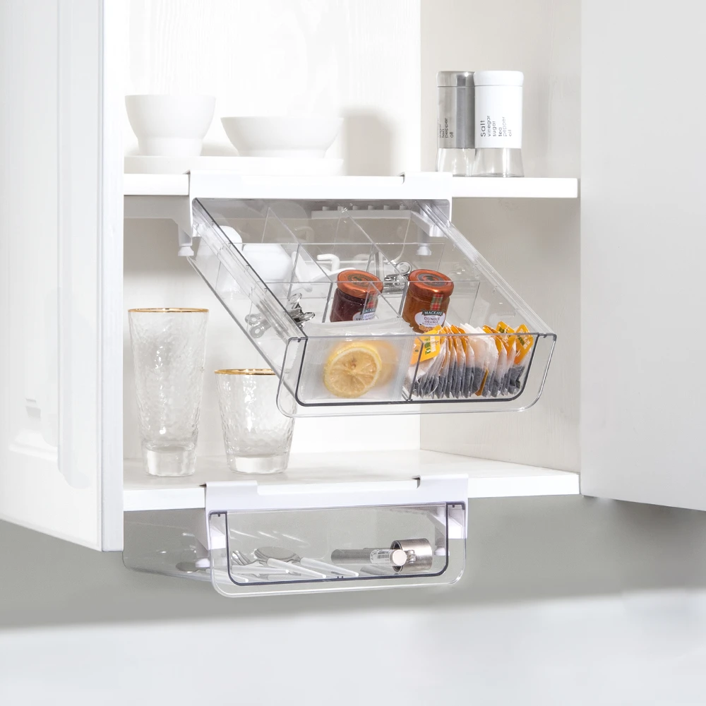 Deze opberglade voor onder een (keukenkast)plank is de ideale oplossing om extra keukenkastruimte te creëren. Bevestig de uitschuifbare opberglade zonder te hoeven boren, en krijg gemakkelijk toegang tot kruidenzakjes, bestek of andere accessoires.