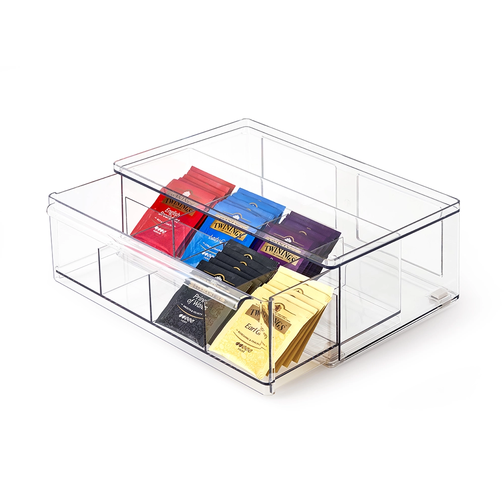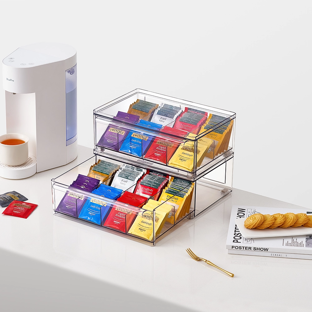 De transparante theedoos van So Clever x Vacane is de perfecte oplossing om je thee collectie netjes en overzichtelijk te organiseren. Met een uitschuifbare lade, stapelbaar ontwerp en kristalhelder PET-kunststof biedt deze thee organizer een elegant en functioneel systeem voor het bewaren van je favoriete theezakjes.