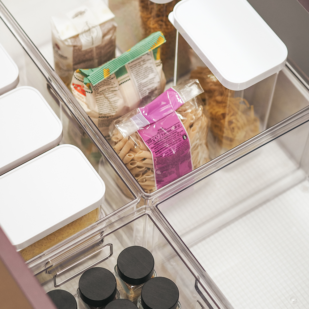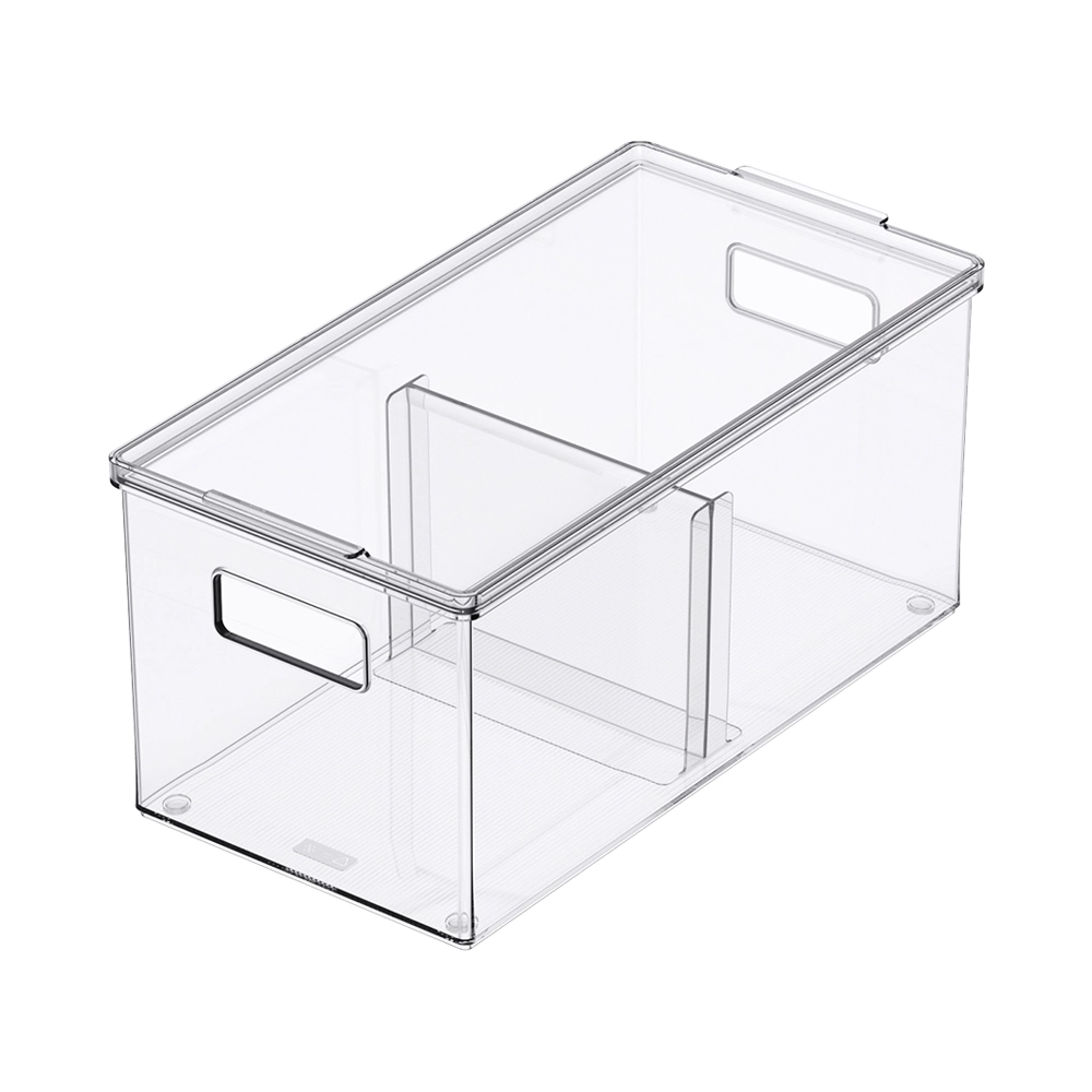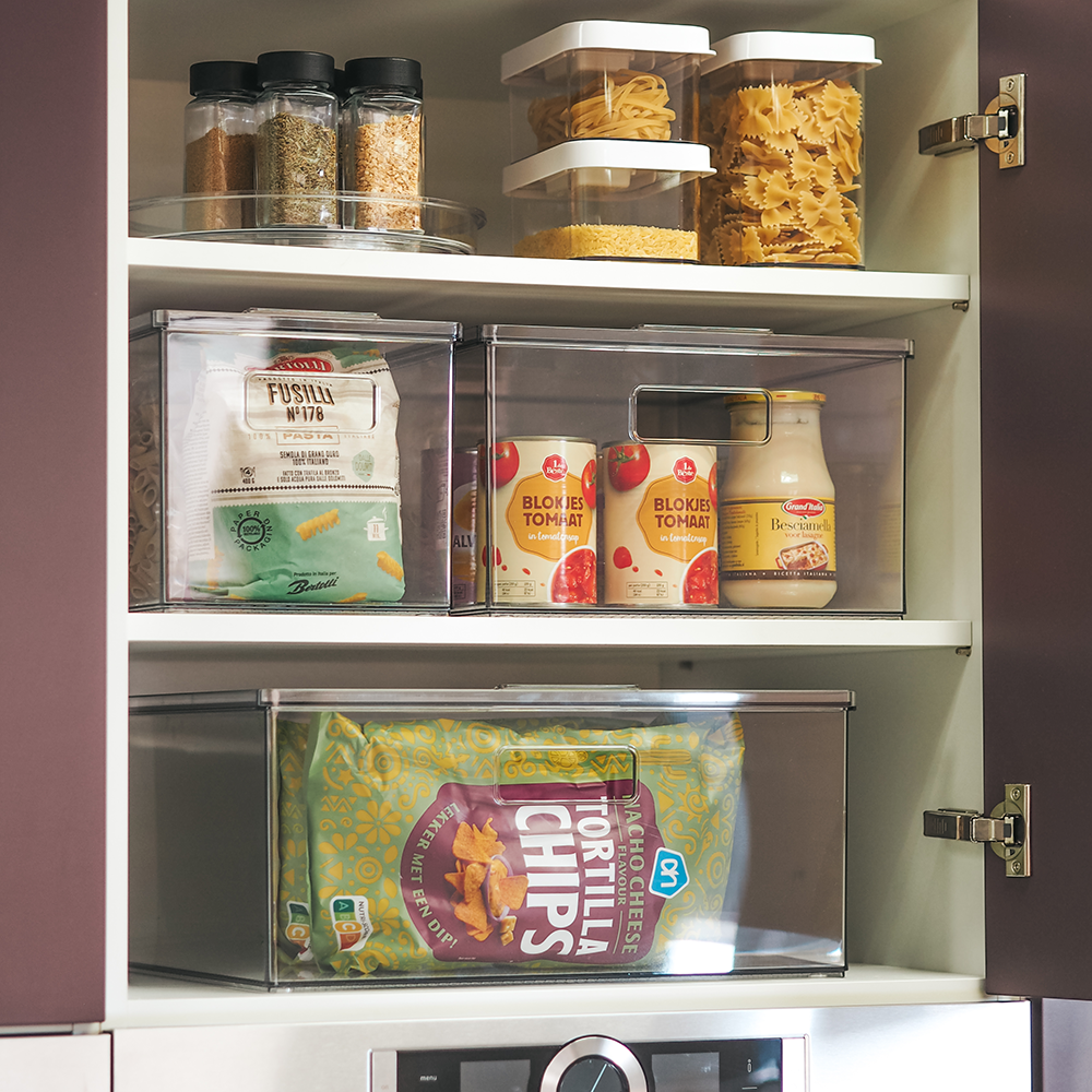 Dankzij het transparante ontwerp kun je in één oogopslag zien wat erin zit, terwijl de stevige constructie zorgt voor langdurig gebruik. De geïntegreerde handgrepen maken het eenvoudig om de bakken te verplaatsen en te stapelen, waardoor je moeiteloos een opgeruimd huis creëert. Deze opbergbakken zijn beschikbaar in zes verschillende formaten, zodat je de perfecte maat kunt kiezen voor jouw opslagbehoeften. Of je nu kleine accessoires, kleding of grotere huishoudelijke items wilt opbergen, deze bakken passen perfect in kasten, diepe lades en schappen. De vierkante hoeken zorgen ervoor dat er geen ruimte verloren gaat, terwijl je met de modulaire indeling eenvoudig verschillende formaten met elkaar kunt combineren. Gebruik een opbergbak met deksel voor extra bescherming of stapel meerdere bakken voor een gepersonaliseerd opbergsysteem. Daarnaast kunnen de opbergbakken door het gebruik van een, bij te bestellen verdeler, in 2 vakken gescheiden worden.