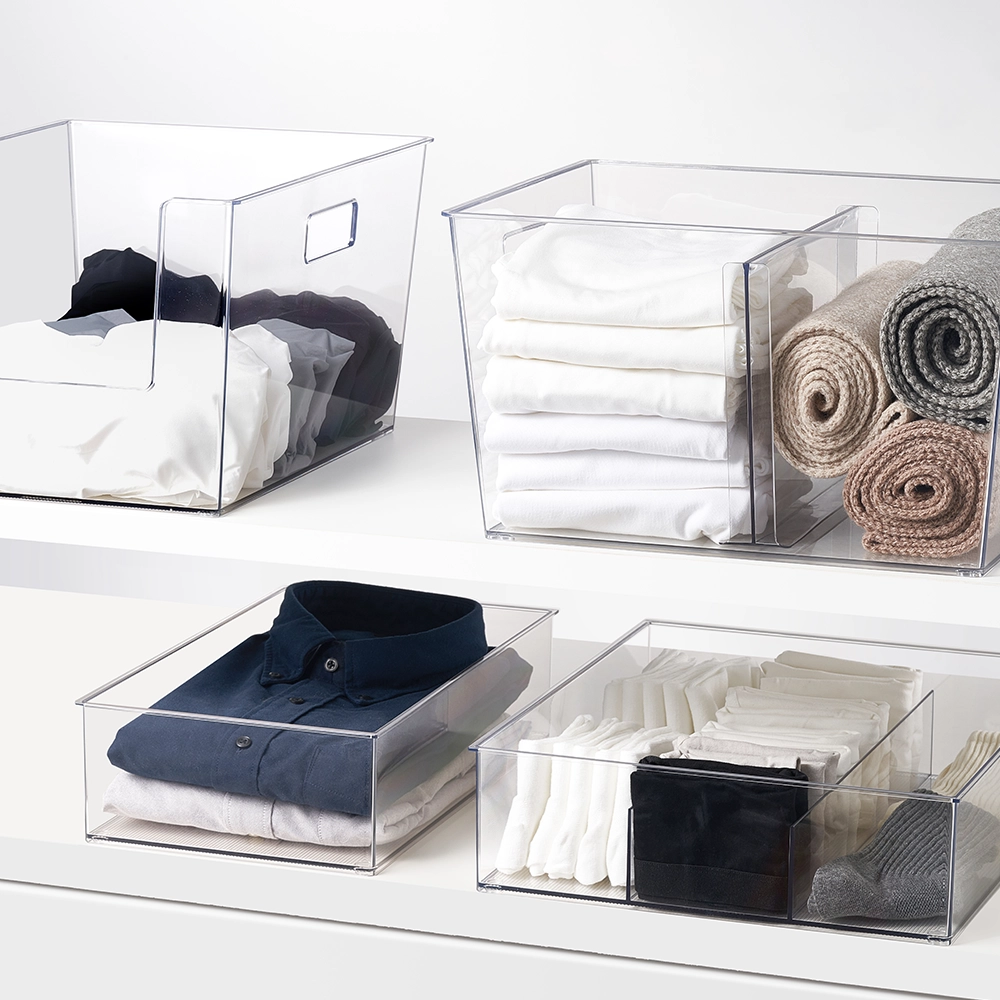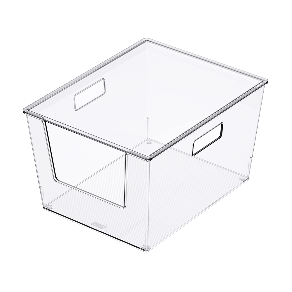 Deze opbergbak is er in twee uitvoeringen, één met een open voorzijde en de andere heeft standaard een (uitneembare) verdeler meegeleverd. De opbergbakken lopen taps omhoog waardoor ze nestbaar zijn. De bak met open voorzijde heeft daarnaast een afneembare deksel waarmee de bak gestapeld kan worden en anti-slip voetjes. De opbergbakken hebben een afmeting van 30 cm breed, 38 cm diep en 22 cm hoog, waardoor hij ideaal is voor gebruik op planken of in kasten. De geïntegreerde handgrepen maken het eenvoudig om de bak te verplaatsen en te herschikken, terwijl de transparante constructie ervoor zorgt dat je in één oogopslag de inhoud kunt zien. Of je hem nu gebruikt voor kleding, speelgoed of keukenspullen, deze stapelbare opbergbak biedt een veelzijdige en functionele opbergoplossing.