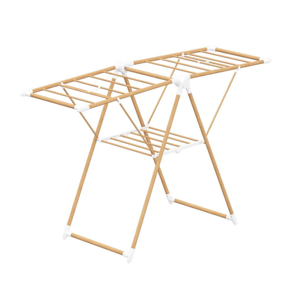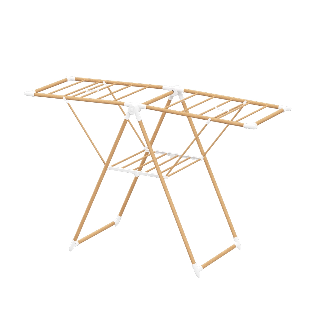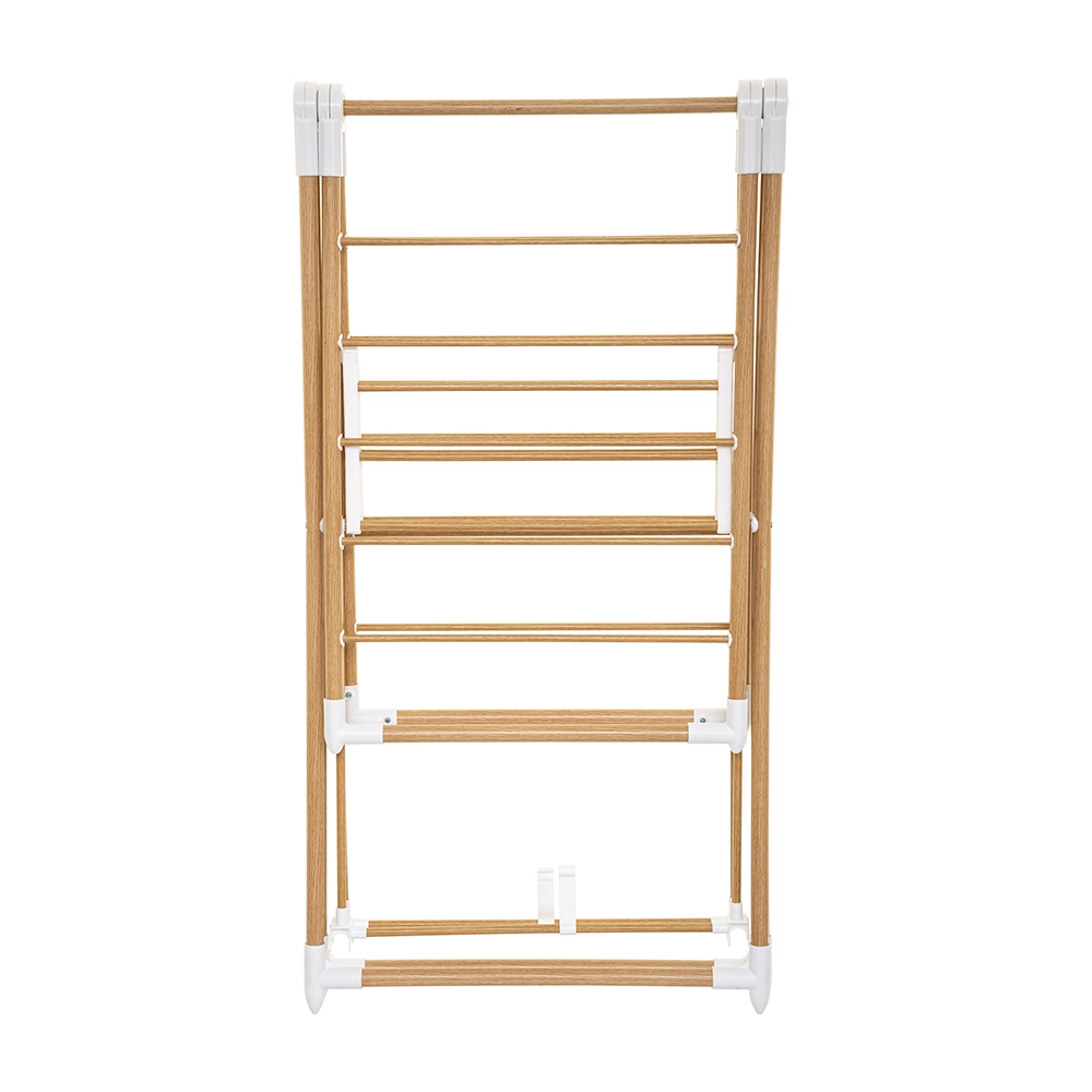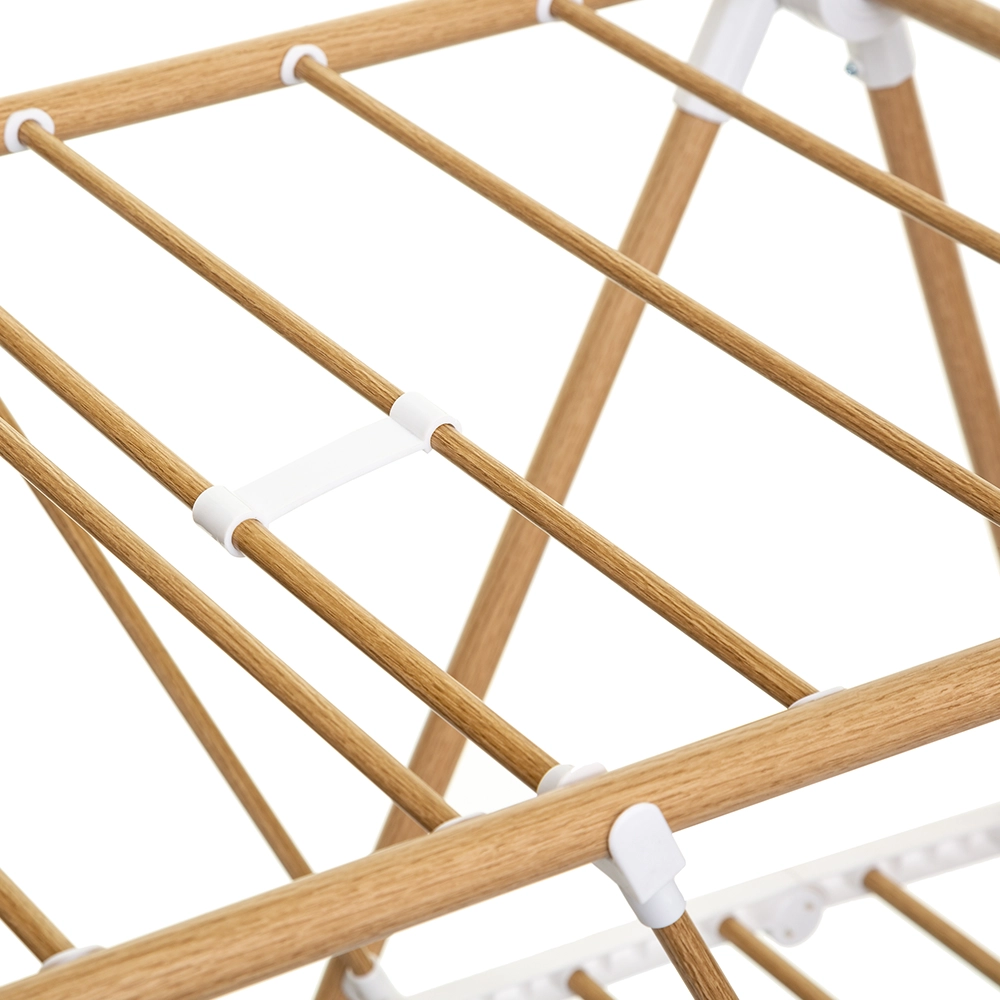De houtlook afwerking van de buizen, gecombineerd met witte koppelstokken, geeft dit droogrek een elegante uitstraling die perfect past in elke ruimte. Dit droogrek met houtlook is niet alleen mooi, maar ook zeer functioneel. De 9,5 mm brede buizen beperken het kreuken van het wasgoed, waardoor je kleding netjes blijft. Dankzij het lichtgewicht inklapbare ontwerp van slechts 2,2 kg is het droogrek gemakkelijk te verplaatsen en op te bergen. De vergrendelingshaak zorgt ervoor dat het droogrek stevig blijft staan tijdens gebruik, terwijl de anti-shock hoekbeschermingen extra veiligheid bieden. Ideaal voor kleine ruimtes, dit droogrek is inklapbaar en kan eenvoudig worden opgeborgen wanneer het niet in gebruik is.