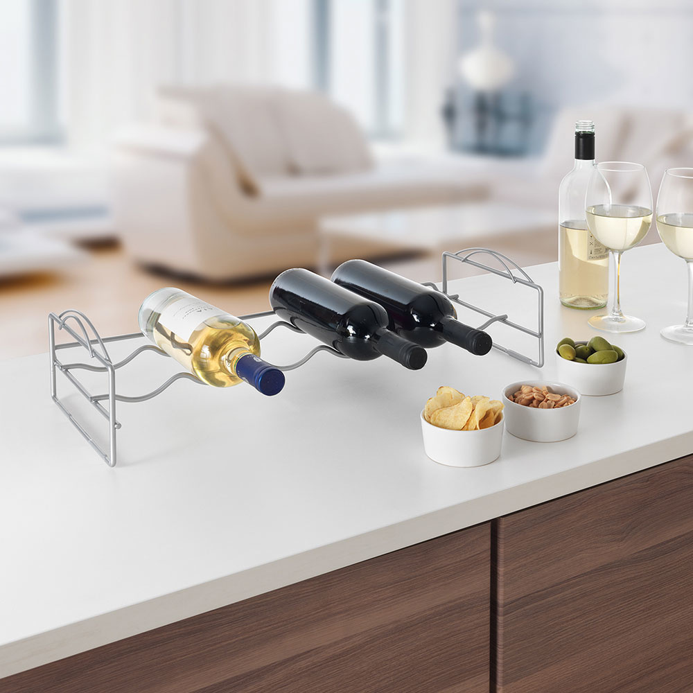 Het flessenrek is gemaakt van metaal en is gemakkelijk afneembaar. Het wijnrek is stapelbaar en zilver van kleur. De afmetingen zijn 56 cm breed, 25 cm diep en 13 cm hoog. Het gewicht van het wijnrek is 0,7 kg.